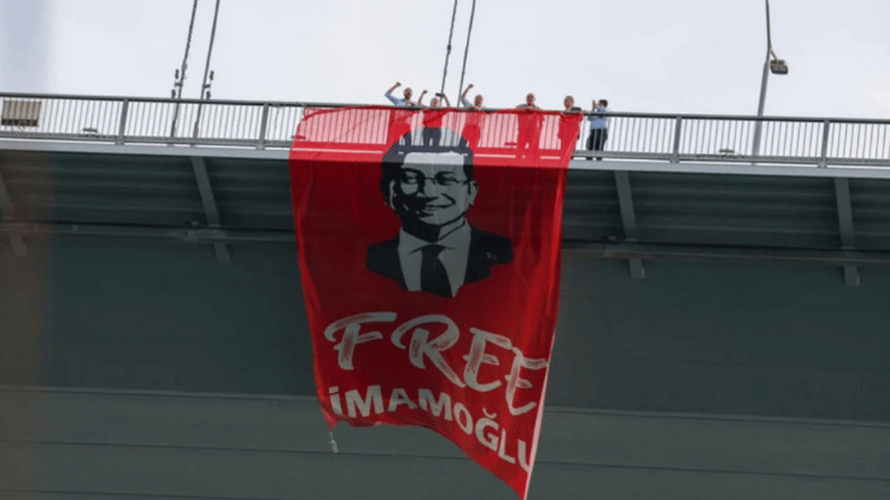 Pankartta İmamoğlu'nun silueti yer alırken üzerinde “Free İmamoğlu” yazısı dikkat çekti.