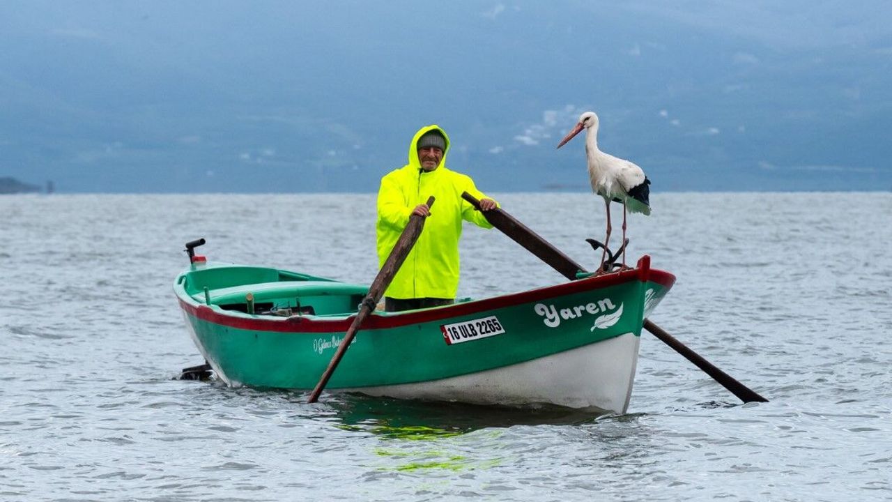 Yaren leyleğin, göl manzaralı yuvasının bulunduğu mahallede balıkçı Yılmaz'ın kayığındaki geleneksel pozu, doğa ve yaban hayatı fotoğrafçısı Alper Tüydeş tarafından kayda alındı.