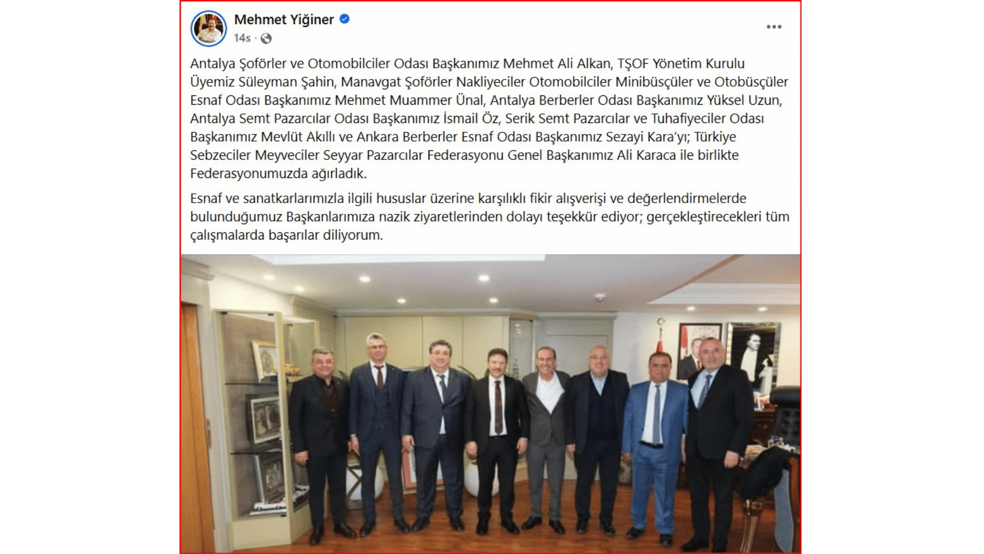 Servisçiler Odası Başkanı Süleyman Şahin, Pazarcılar Odası Başkanı İsmail Öz, Kahveciler Odası Başkanı Murat Ağaoğlu ve Berberler Odası Başkanı Yüksel Uzun’un Alkan öncülüğünde Türkiye Şoförler Federasyonu Başkanı Mehmet Yiğiner’i ziyaretleri ile çalışmalara start verildi.