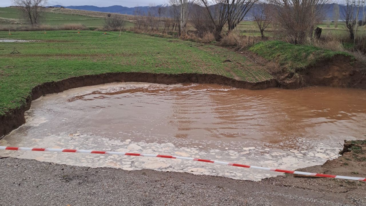 Çöken alanda su birikintisi oluştu, etrafındaki tarım arazisi zarar gördü.