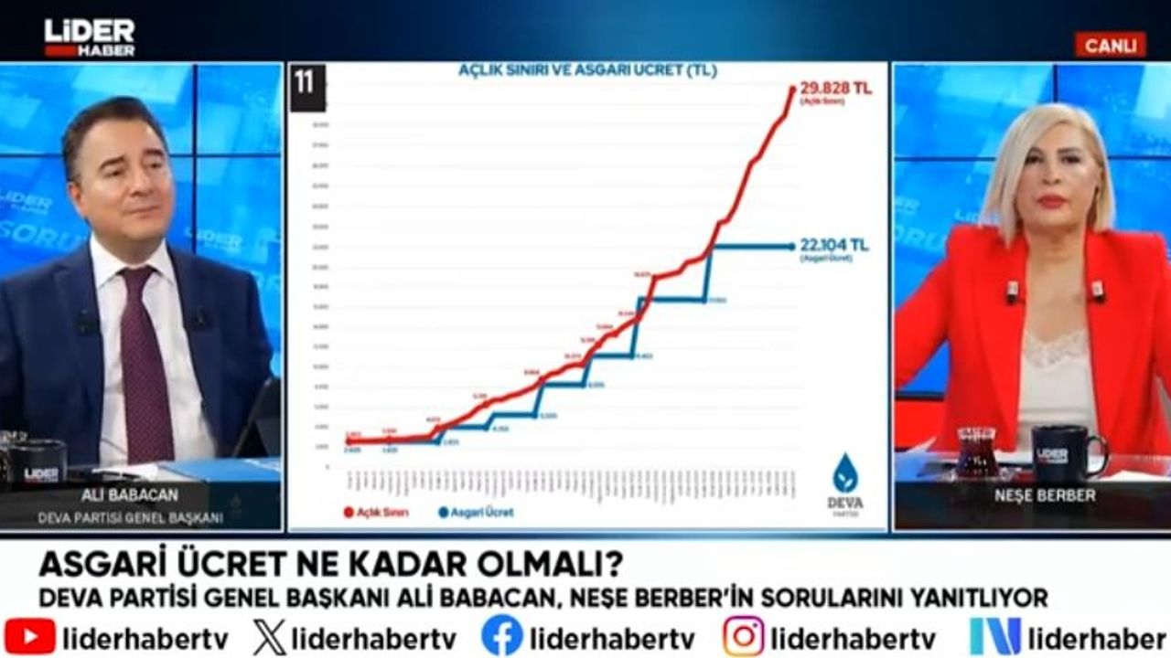 DEVA Partisi Genel Başkanı Ali Babacan, Lider Haber TV’de yayınlanan “Soruyoruz” programında Neşe Berber’in sorularını yanıtladı. Babacan, 2026 yılı asgari ücreti için yapılması gereken zam oranına ilişkin değerlendirmelerde bulundu.