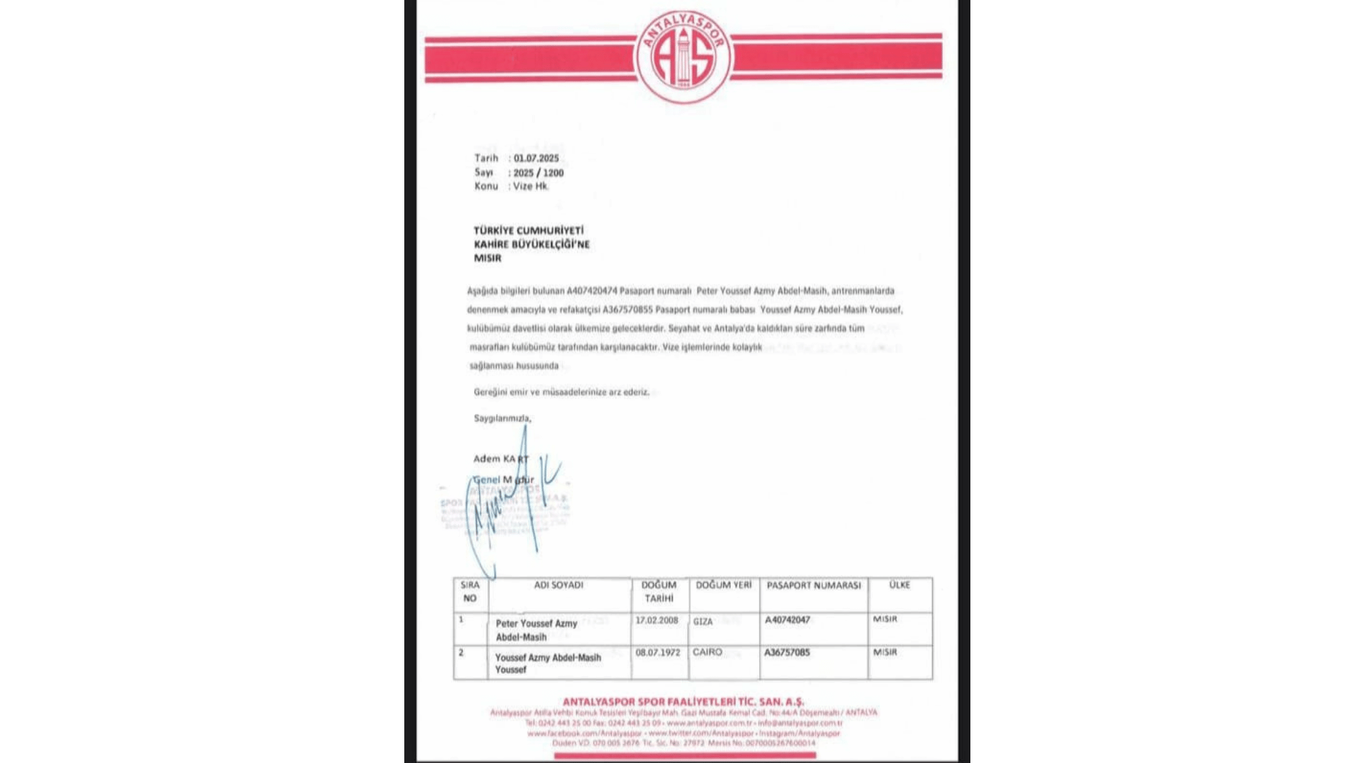 Yazıda, “Aşağıda bilgileri bulunan A....474 pasaport numaralı PETER YOUSSEF AZMY ABDEL-MASİH, antrenmanlarda denenmek amacıyla ve refakatçisi A......855 Pasaport numaralı babası YOUSSEF AZMY ABDEL-MASİH YOUSSEF, kulübümüz davetlisi olarak ülkemize geleceklerdir. Seyahat ve Antalya'da kaldıktan süre zarfında tüm masrafları kulübümüz tarafından karşılanacaktır. Vize işlemlerinde kolaylık sağlanması hususunda Gereğini emir ve müsaadelerinize arz ederiz. Saygılarımızla” ibaresi yer alıyor.