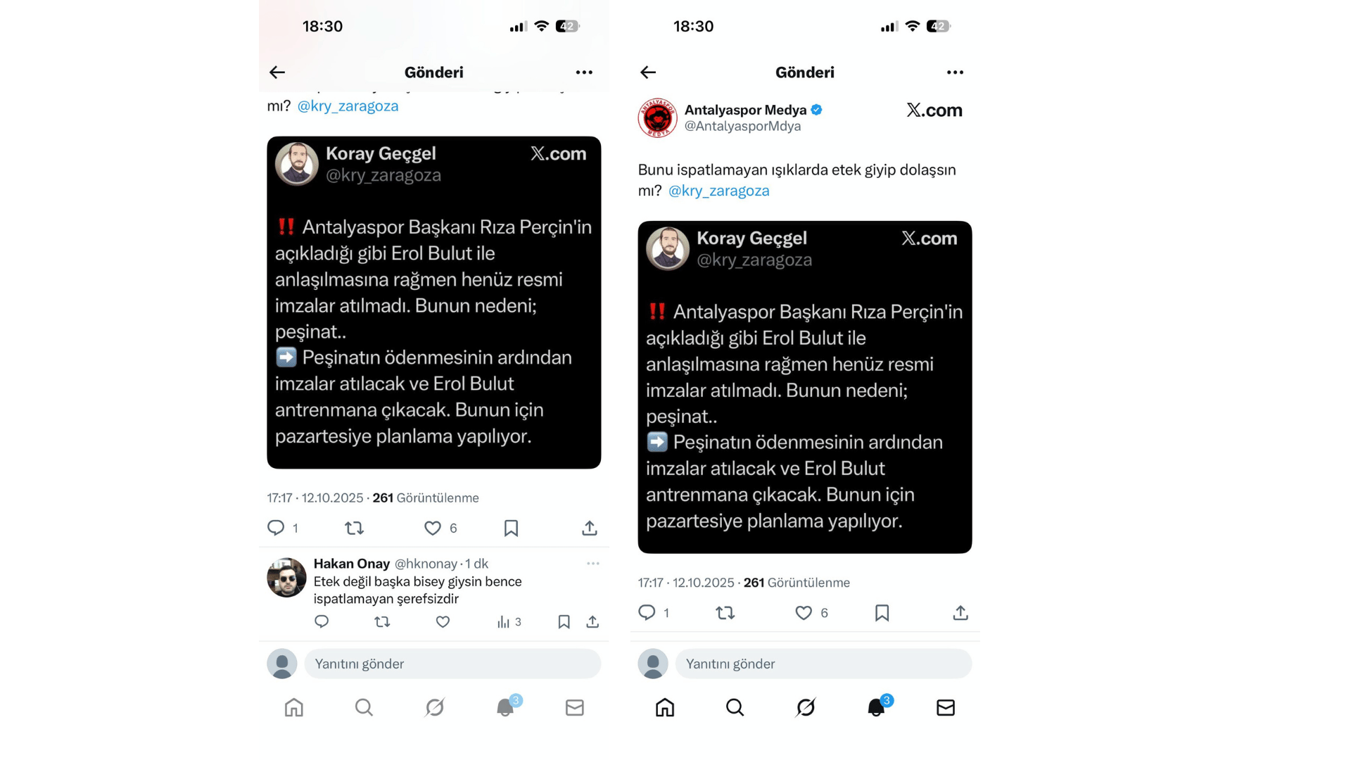 Sanal medyadaki Antalyaspor Medya hesabından Geçgel’in yaptığı paylaşımın üstüne “Bunu ispatlayamayan ışıklarda etek giyip dolaşsın mı?” ifadeleri yer alıyordu. HAMAMCI çok terlemiş ve bunalmış olacak ki balıklama konuya dalmış.