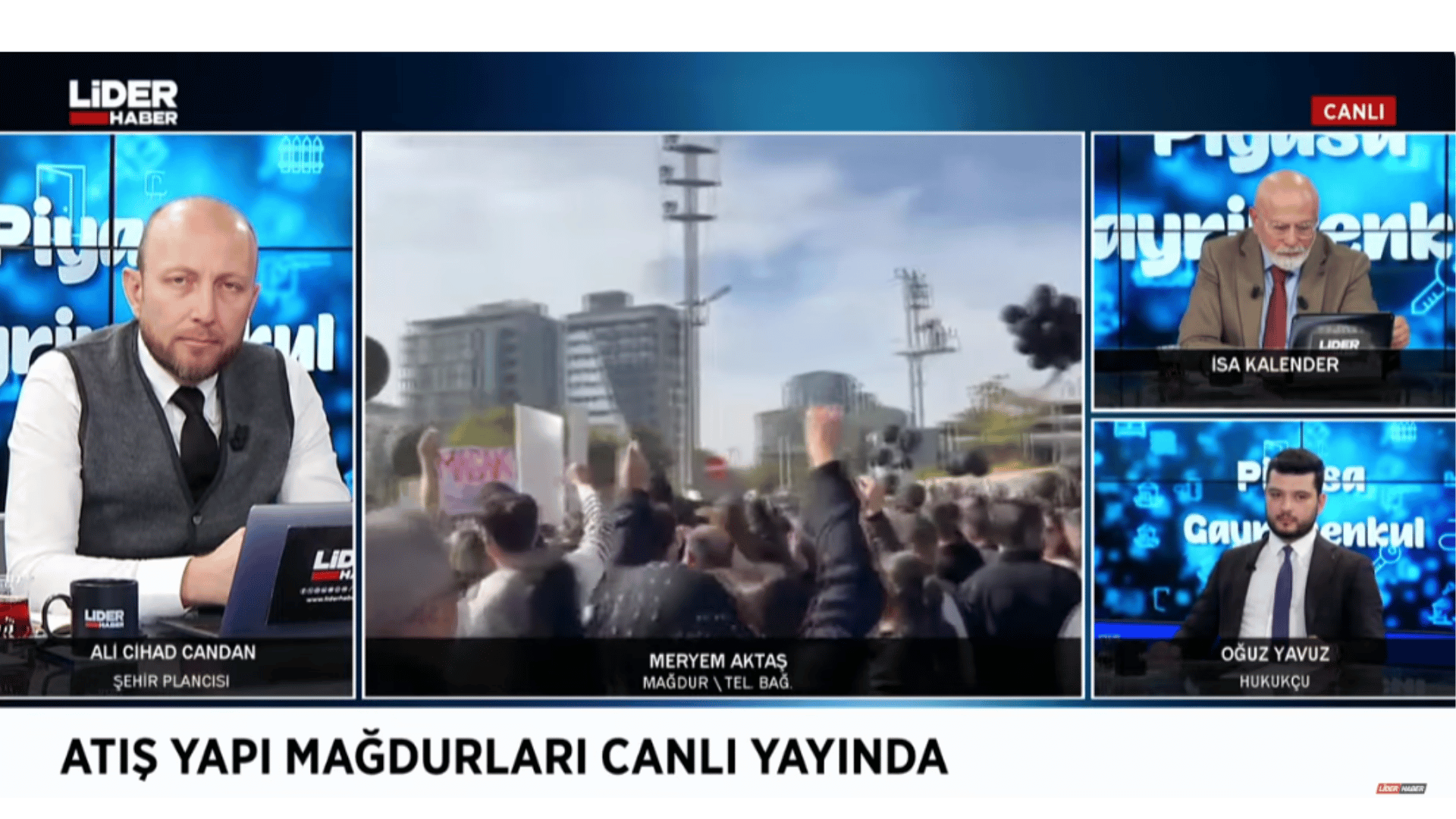 Lider Haber TV’de yayınlanan Piyasa Gayrimenkul programında gündeme getirildi. İsa Kalender’in moderatörlüğündeki programda Hukukçu Oğuz Yavuz ve Şehir Plancısı Ali Cihad Candan, Atış Yapı mağdurlarının durumunu ve Körfez ülkelerindeki mağdurların ilettikleri bilgileri yorumladı.