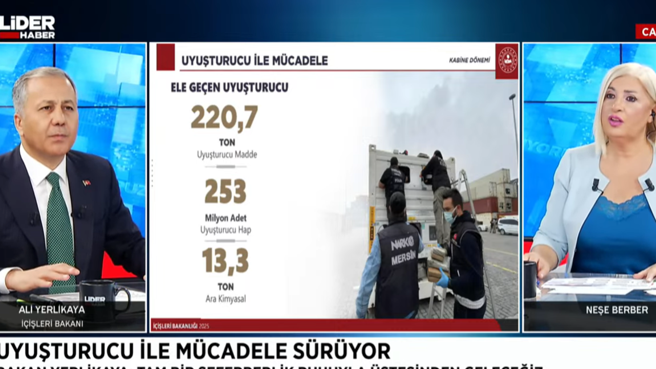 İçişleri Bakanı Ali Yerlikaya, Lider Haber TV’de canlı yayında kritik açıklamalarda bulundu. Bakan Yerlikaya, Türkiye’de uyuşturucuyla mücadelede gelinen son duruma ilişkin bilgi verdi.