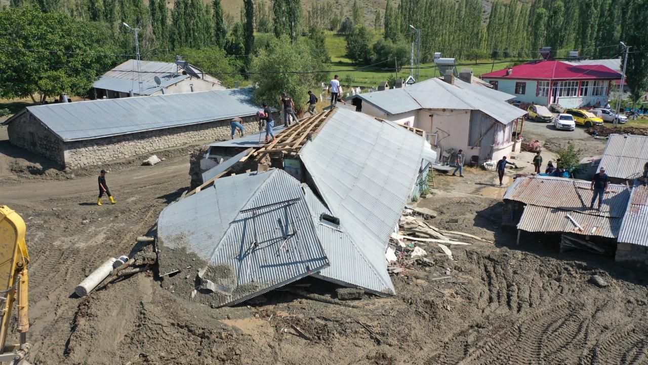 İl Özel İdaresi ekipleri Aşağıdut köyünde yıkılan evlerin çevresinde çalışmasını sürdürüyor. Çamurla dolan evler, bahçeler iş makinesi yardımıyla temizleniyor. AA