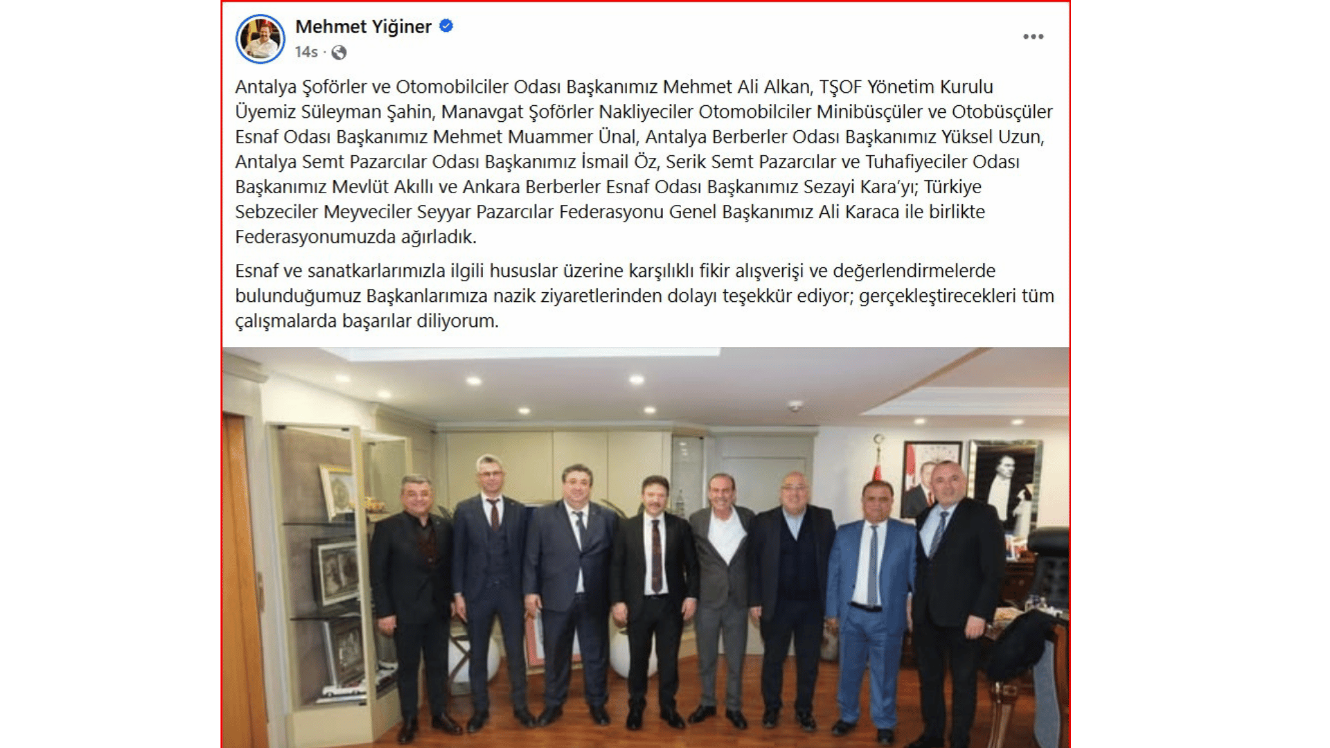 Önceki gün, Antalya Şoförler ve Otomobilciler Odası Başkanı Mehmet Ali Alkan, Servisçiler Odası Başkanı Süleyman Şahin, Manavgat Şoförler Odası Başkanı Mehmet Muammer Ünal, Antalya Berberler Odası Başkanı Yüksel Uzun, Antalya Semt Pazarcılar Odası Başkanı İsmail Öz, Serik Semt Pazarcılar ve Tuhafiyeciler Odası Başkanı Mevlüt Akıllı koştur koştur Ankara’ya gitmişler!