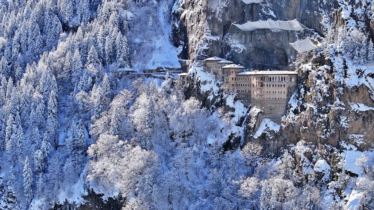 Karadağ'ın Altındere Vadisi'ne bakan eteğinde, vadiden yaklaşık 300 metre yükseklikteki ormanlık alanda kayaların oyulmasıyla yapılan ve halk arasında "Meryem Ana" adıyla bilinen Sümela Manastırı, kar yağışıyla beyaza büründü.