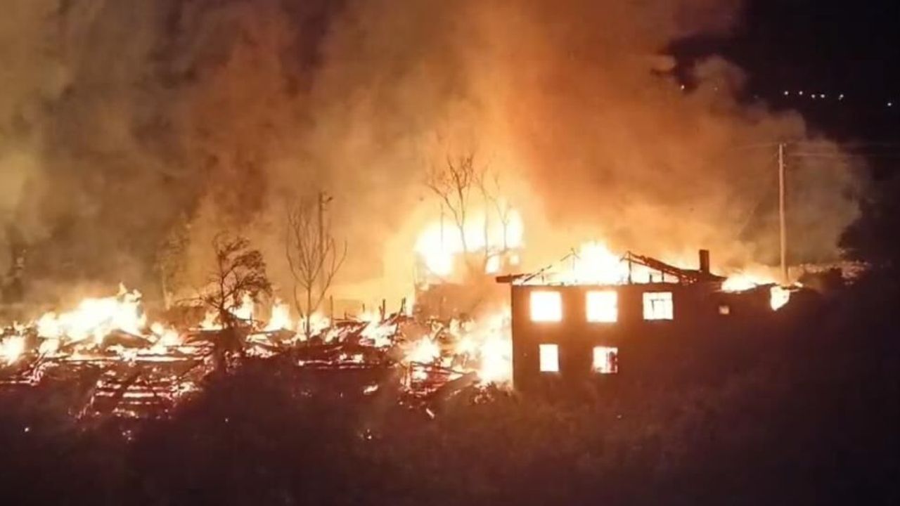 Toplamda 12 yapının alevlere teslim olduğu yangın, dronla havadan görüntülendi. Köyün havadan çekilen görüntülerinde alevlerin geceyi aydınlattığı görüldü.