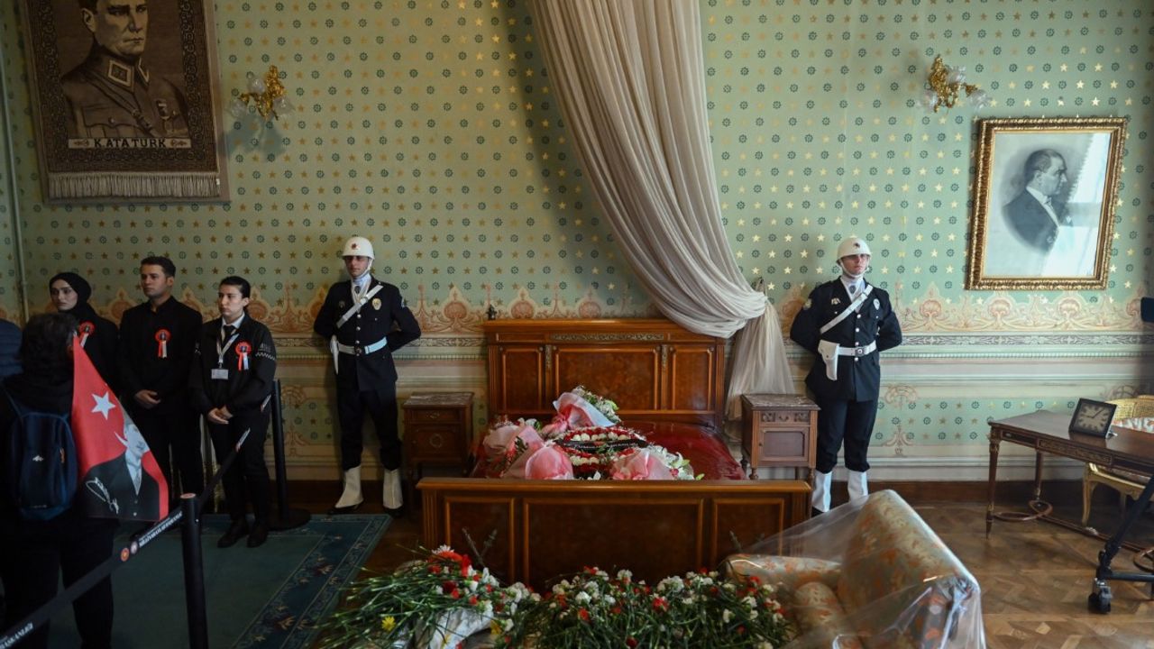 Mustafa Kemal Atatürk'ün 10 Kasım 1938'de yaşamını yitirdiği Türk bayrağı örtülü yatağının iki yanında, iki polis memuru saygı nöbeti tuttu. Odadaki tören, dışarıya kurulan ekranlardan da izlenebildi.