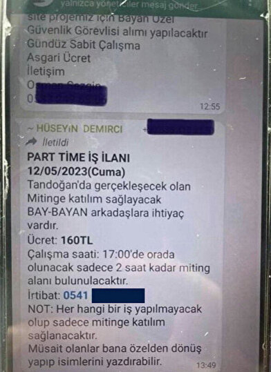 Ankara Büyükşehir Belediyesi'nin Belka Şirket yöneticisinin WhatsApp gruplarına iş ilanı adı altında attığı mesajlar ortaya çıktı. Gönderilen mesajda, "Tandoğan'da gerçekleşecek olan mitinge katılım sağlayacak bay-bayan arkadaşlara ihtiyaç vardır. 17.00'de orada olunacak sadece 2 saat kadar miting alanında bulunulacaktır. Herhangi bir iş yapılmayacak olup sadece mitinge katılım sağlanacaktır." ifadelerine yer verildi.