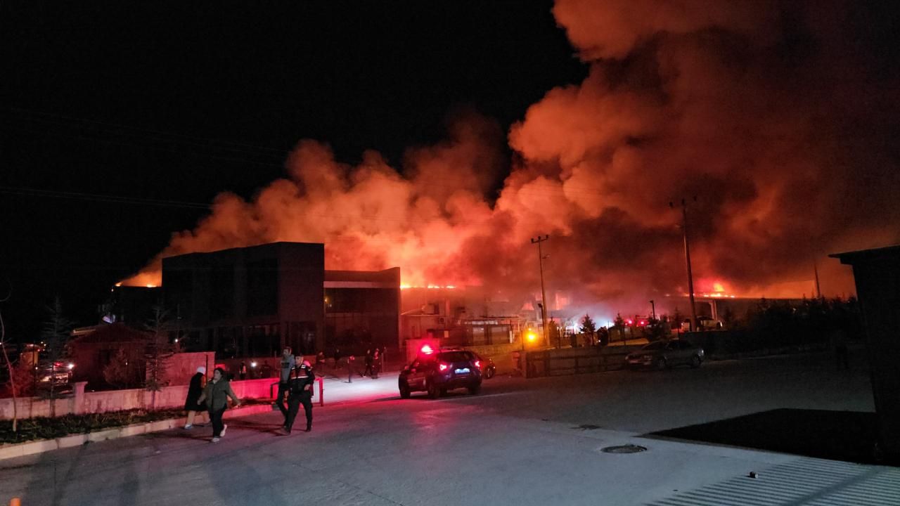 Alevlerin tamamen sardığı, ara ara patlamaların gerçekleştiği fabrikaya ekiplerin müdahalesi sürüyor. AA