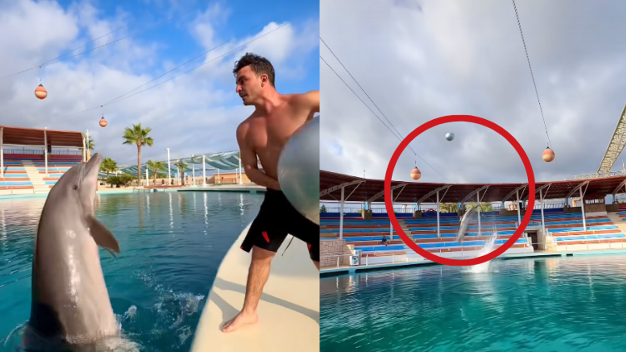 Ardından denize pilates topu atan Abdü, yunusun bu topa suyun altından hızla süzülerek havada rövaşata yapmasını sağladı. Topun havalara uçtuğu bu anlar sosyal medyada büyük ilgi gördü.