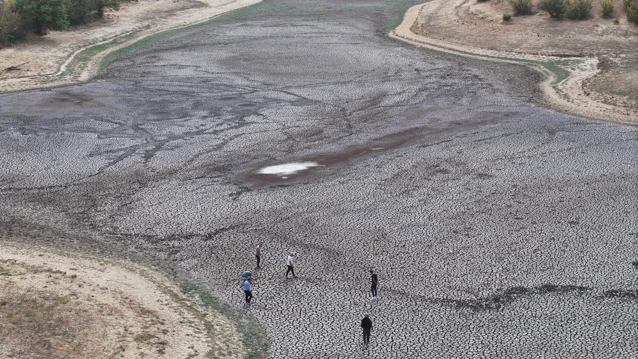 Kuruma nedeniyle göletin tabanında derin çatlaklar oluştu, besiciler farklı su kaynaklarından hayvanlarını sulamaya çalışıyor.