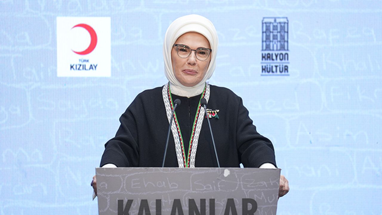 Programda konuşan Emine Erdoğan, "Bizim televizyon ekranlarına yansıdığında bakmakta dahi zorlandığımız bu yakıcı acıların merkezinde yaşayan Filistinliler, dipdiri bir imanla 'Allah bize yeter. O ne güzel vekildir' diyorlar. O yüzden hala boyunlarında evlerinin anahtarlarını taşıyorlar. O anahtarlarla bir gün yeniden evlerinin kapılarını açmak için sabrediyorlar. Küllerinden doğacak bir Gazze'ye inanıyorlar. Biz de inanıyoruz." ifadelerini kullandı.