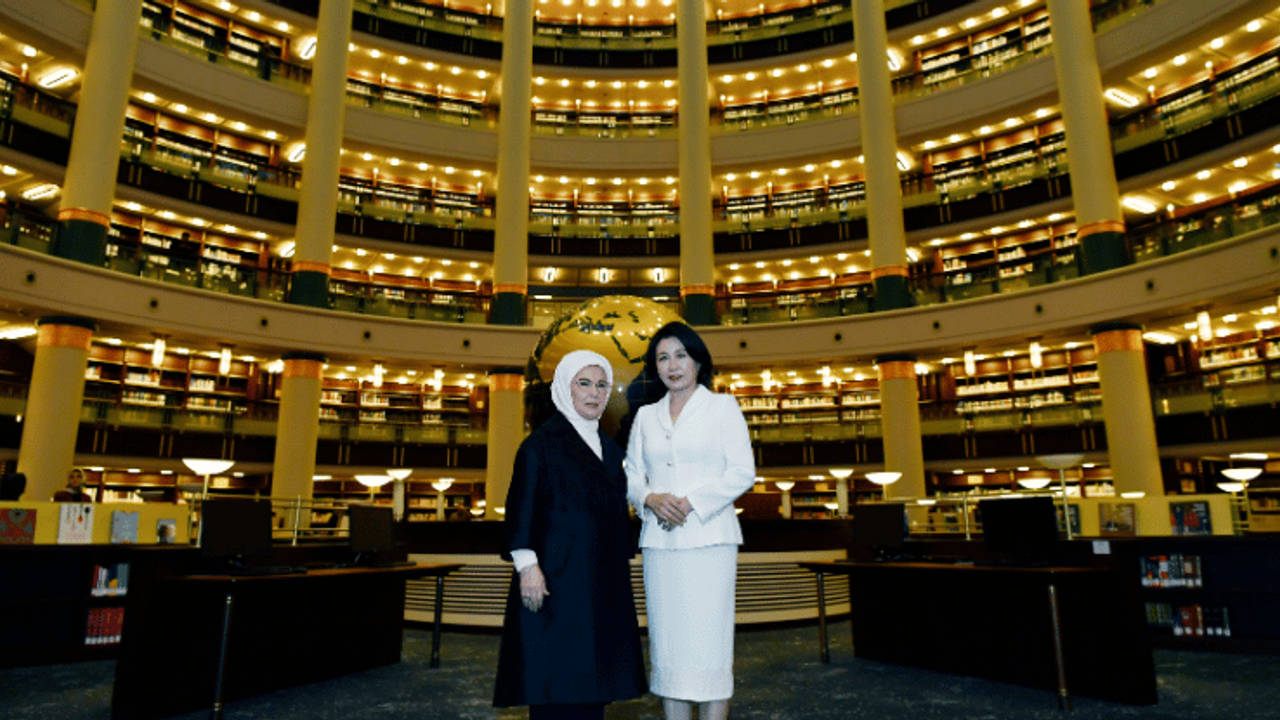 Kütüphanenin Cihannüma Salonu'na geçen lider eşleri, Güney Kore Kitaplığı'ndaki eserleri inceledi.