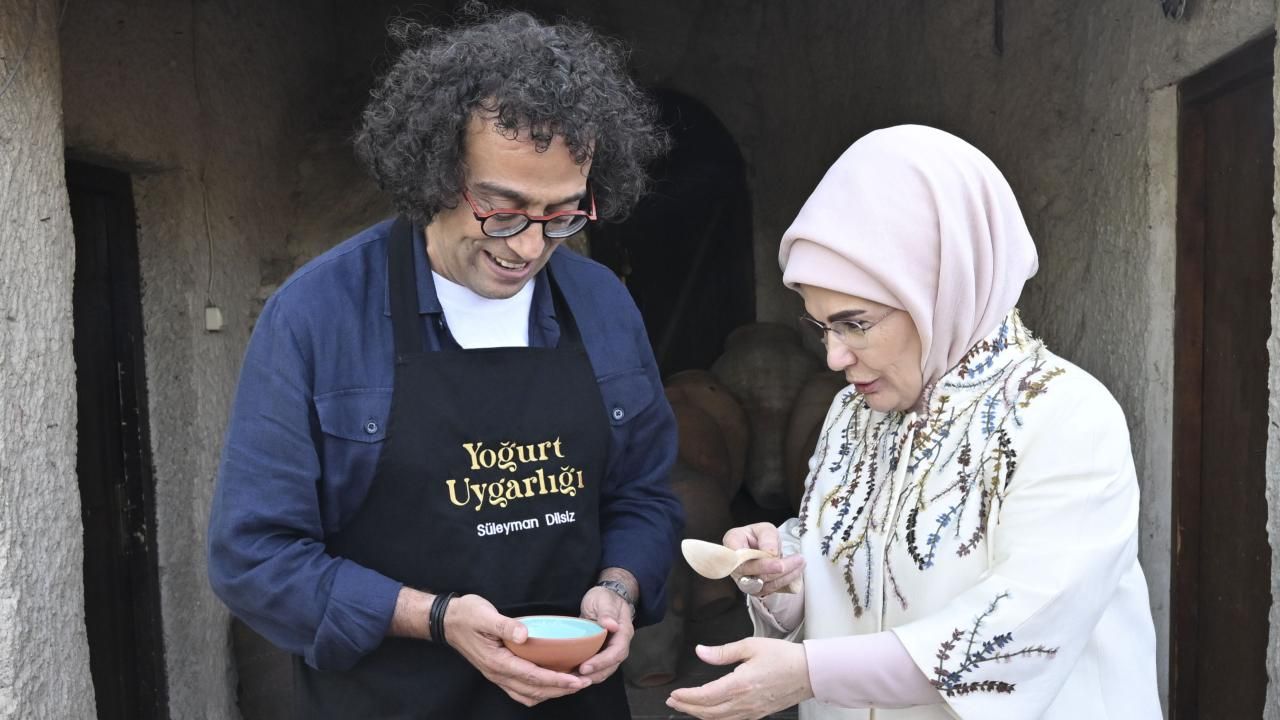 Burada yazar Süleyman Dilsiz ile Kapadokya'ya özgü çömleğe yoğurt mayalayan Emine Erdoğan, aynı yöntemle daha önce mayalanan yoğurdun da tadına baktı.