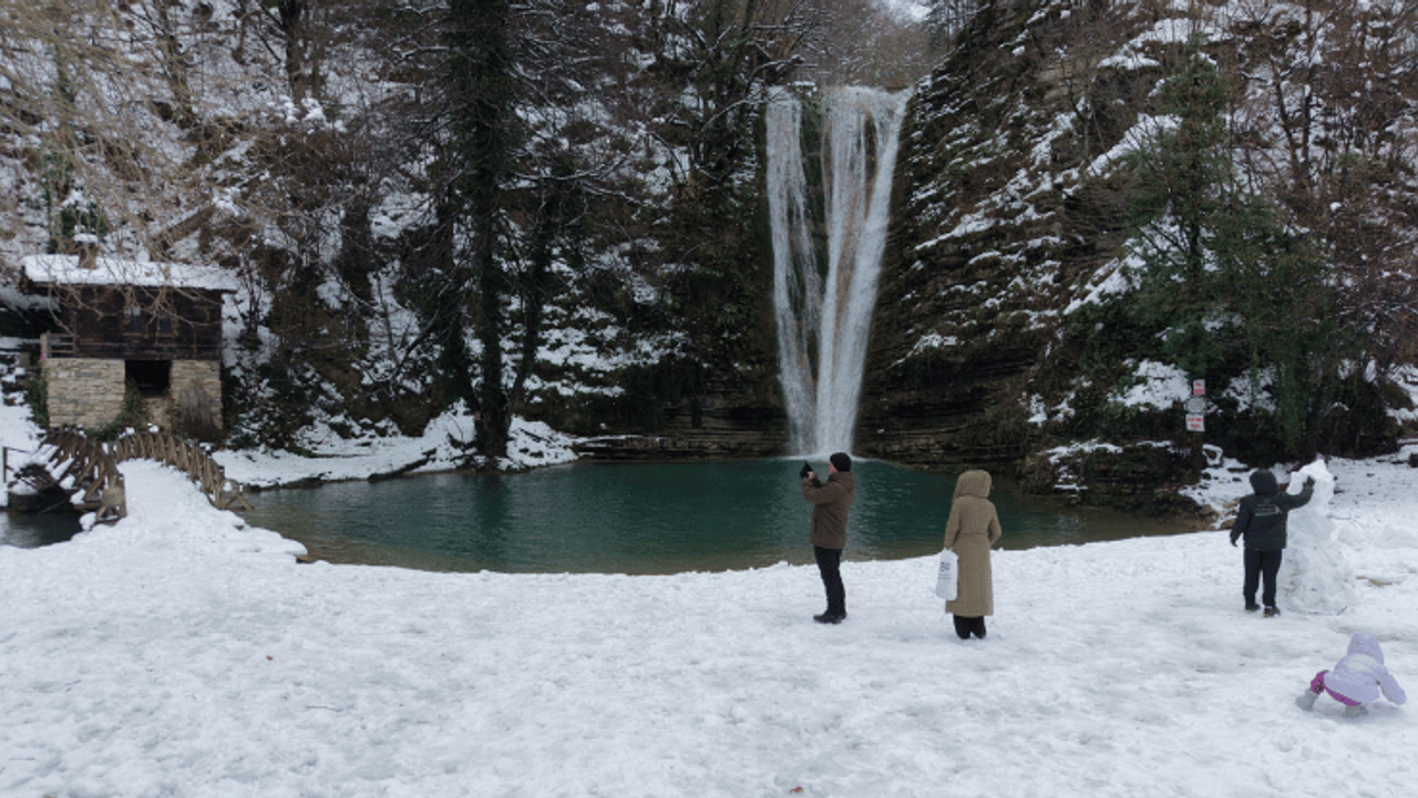 Ziyaretçiler, karla kaplanan şelalede yürüyüş yaparken, çocuklar aileleriyle kartopu oynayarak güzel vakit geçirme imkanı buluyor.
