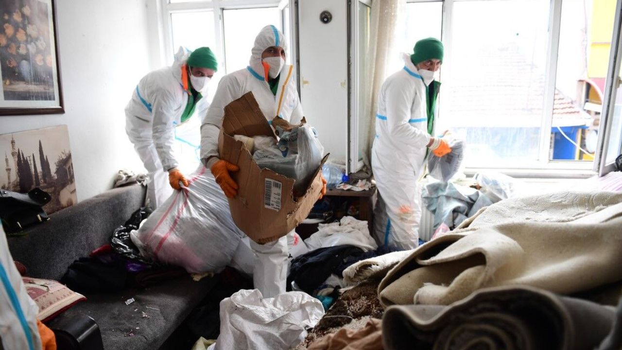 Belediyenin Temizlik İşleri Müdürlüğü ekipleri, evde uzun süredir biriktirilen ve istiflenerek kötü kokuya neden olan kıyafetleri ve atıkları ayrıştırılarak torbaladı.