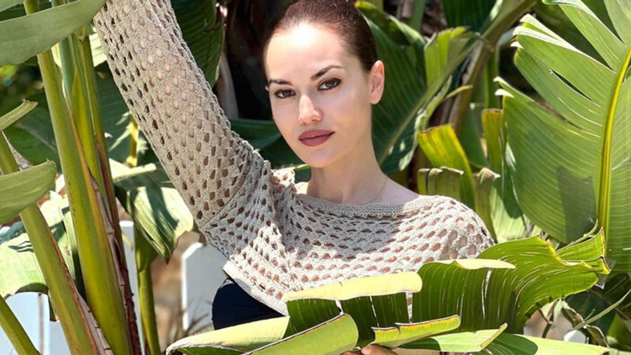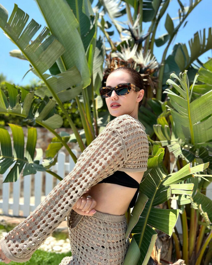 Siyah bikinisinin üstüne bej renginde bir plaj kıyafeti tercih eden Evcen, bir ağacın dallarının arasında objektif karşısına geçti.