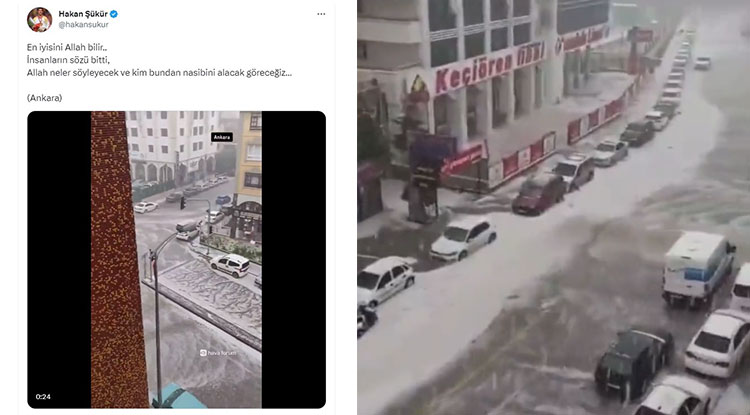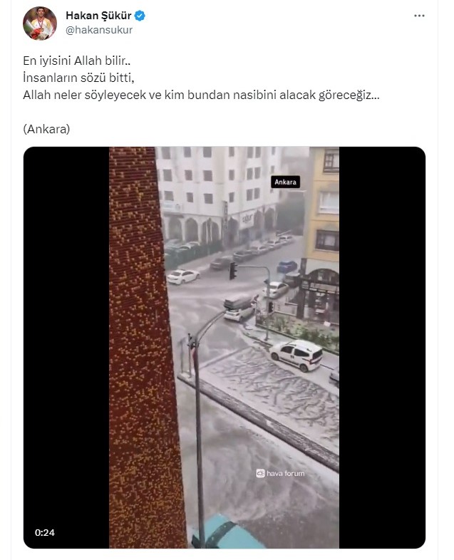 Ankara'daki seli seçim sonuçlarına bağlayan Şükür, felaketin 'ilahi gazap' olduğunu ima etti. Cadde ve sokakların göle döndüğü anlara ilişkin bir görüntüyü paylaşan Şükür "En iyisini Allah bilir..İnsanların sözü bitti, Allah neler söyleyecek ve kim bundan nasibini alacak göreceğiz…" ifadelerini kullandı.