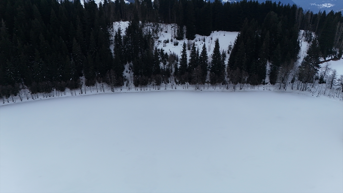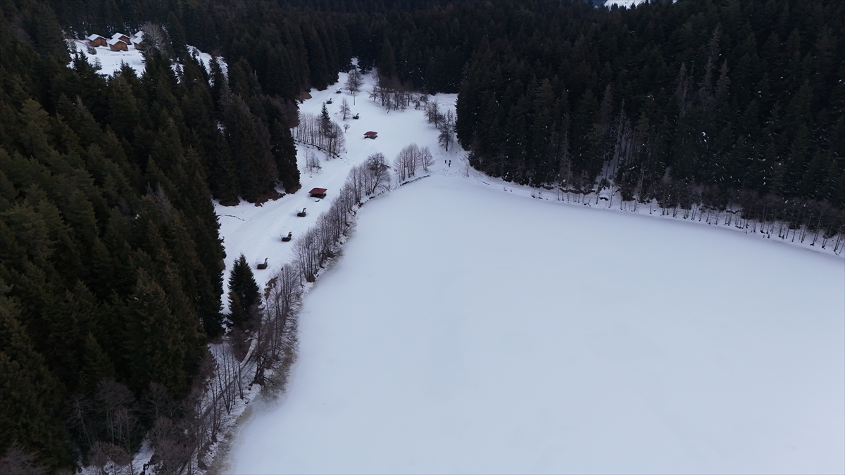 Hava sıcaklıklarının düşmesiyle yüzeyi tamamen donan gölü görebilmek için bölgeye gelen bazı ziyaretçiler, buz üzerinde yürüyüş yapıp horon oynadı.