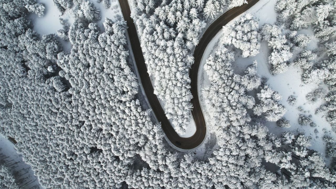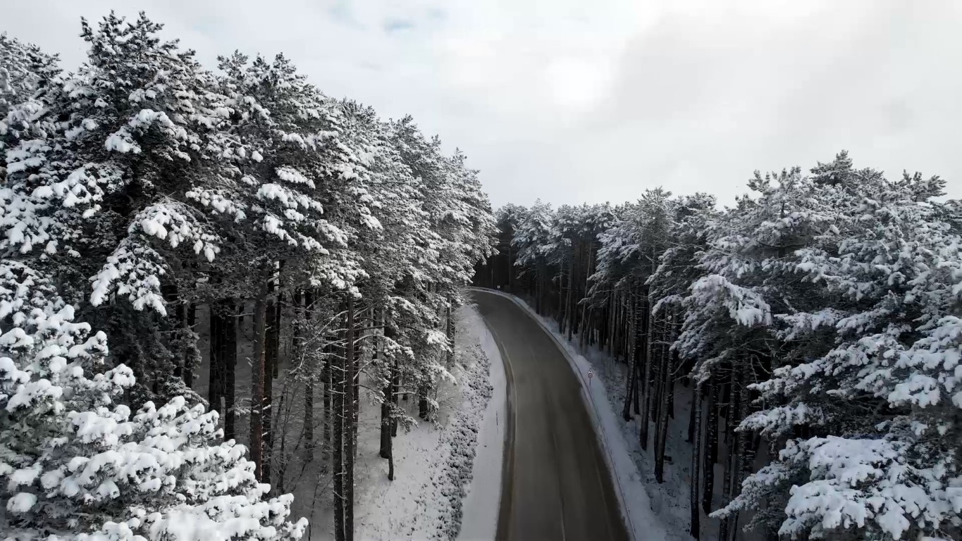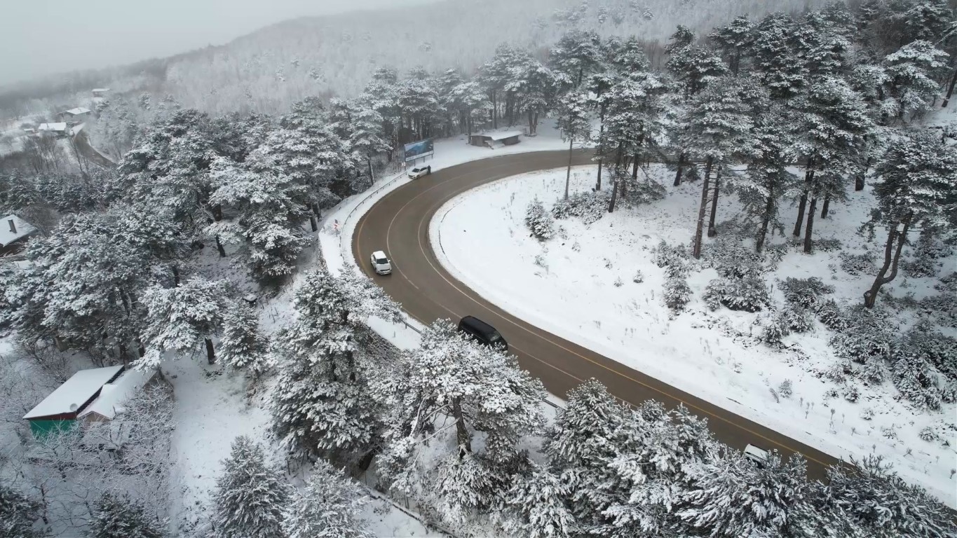 Kış mevsiminin etkisiyle beyaza bürünen ormanlık alanlar arasında ilerleyen yollar, havadan çekilen görüntülerde kartpostallık kareler oluşturdu.