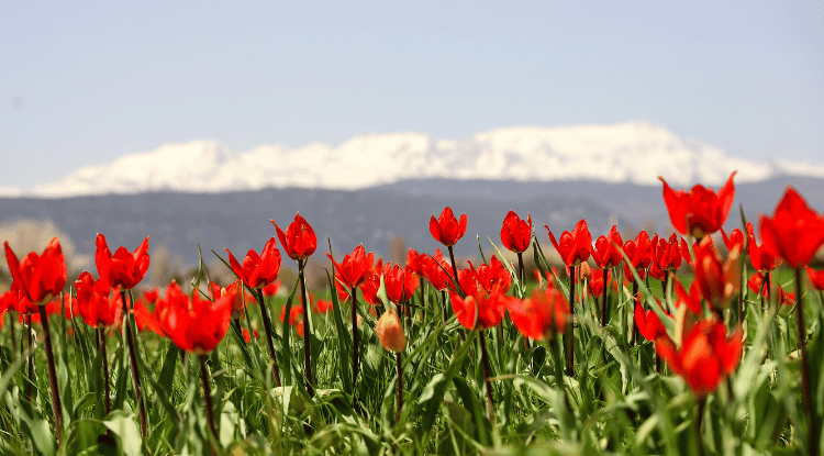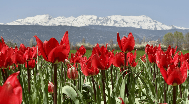 Göl havzasında Adaköy Mahallesi'nin arazilerinde açan laleler de Anamas Dağı'nın karlı manzarasıyla kırmızı, beyaz, yeşil ve maviyi buluşturdu.