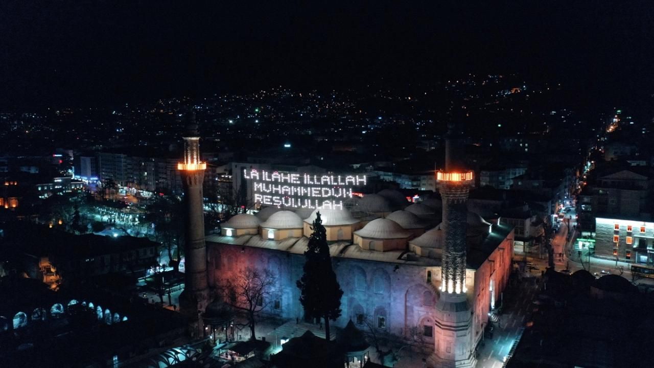 Ulu Cami'nin 70 metre mesafesindeki iki minareye asılan mahya, ramazanın ikinci yarısında Kelime-i Tevhid mahyasıyla değiştirildi.