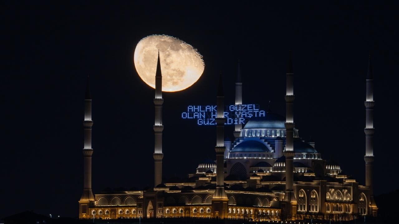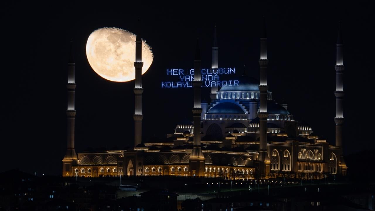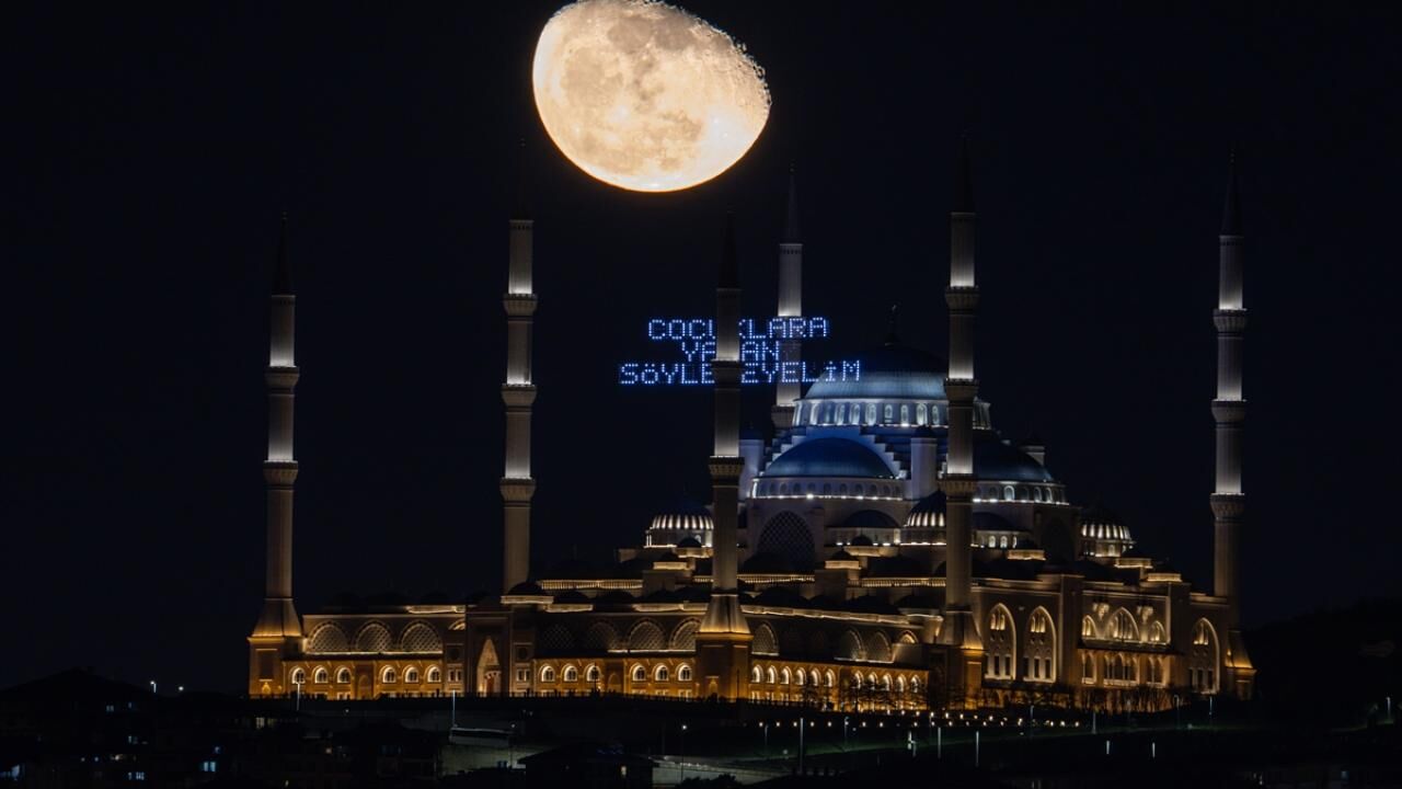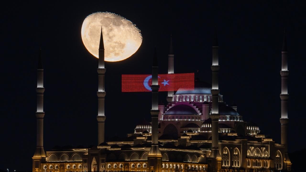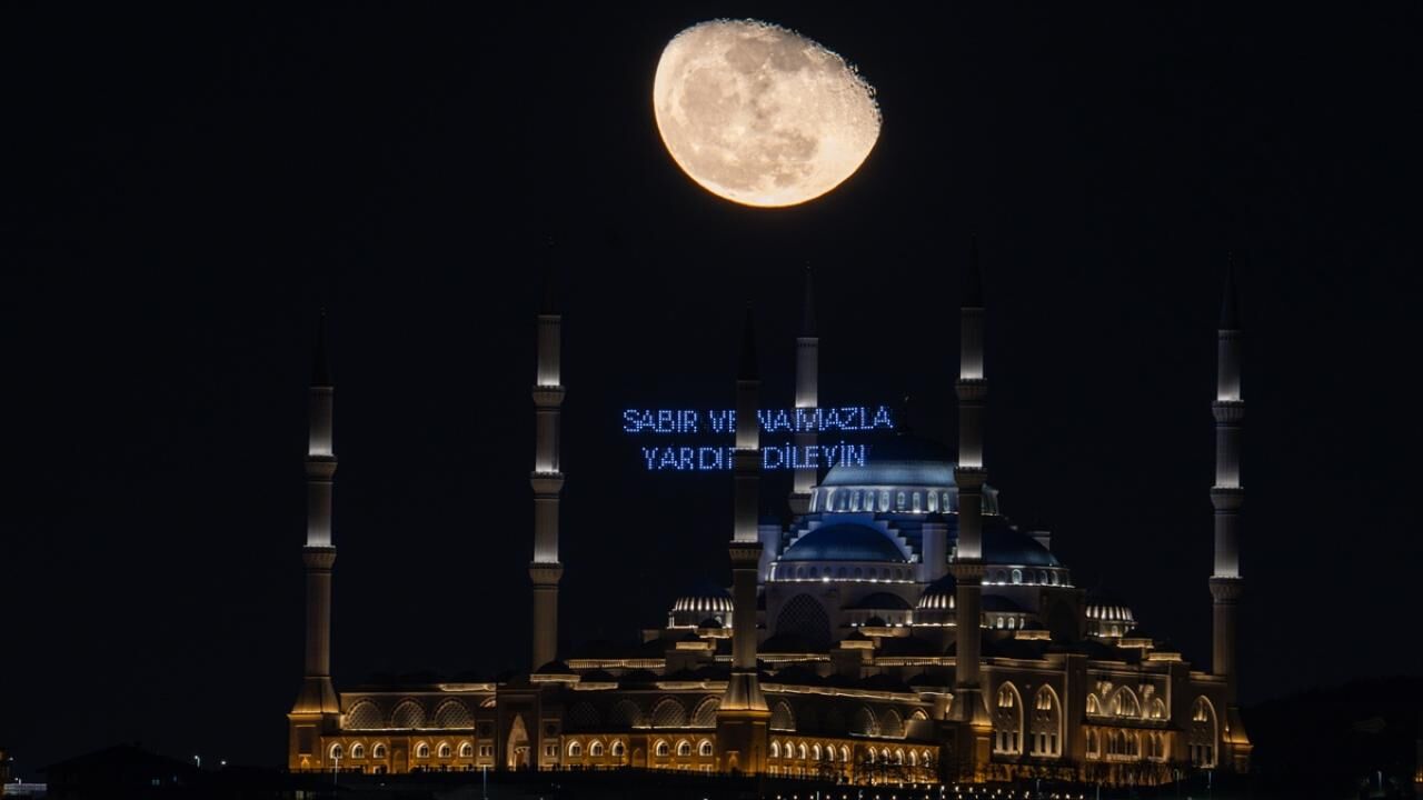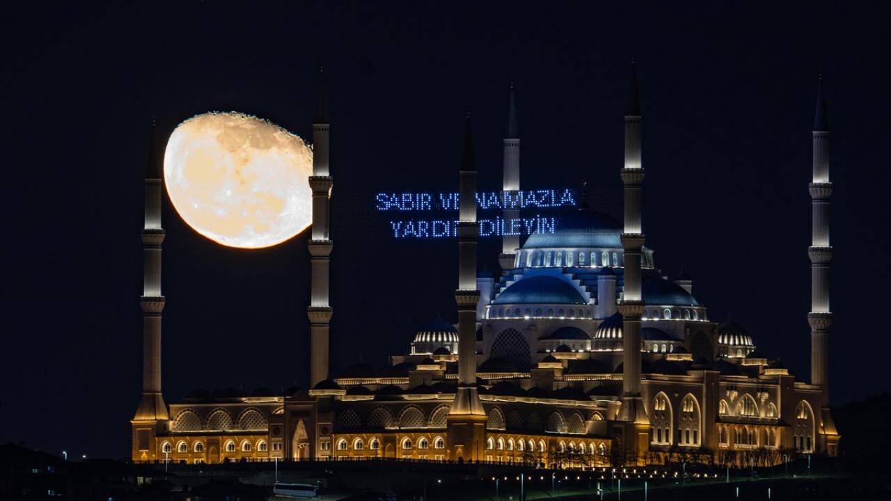 İstanbul’da küçülen şişkin ay, ramazan ayı dolayısıyla Büyük Çamlıca Camii'nin minareleri arasına asılan mahyalar ve Türk bayrağı ile görüntülendi.