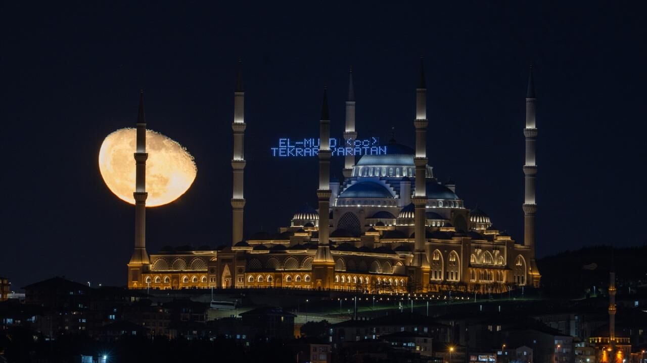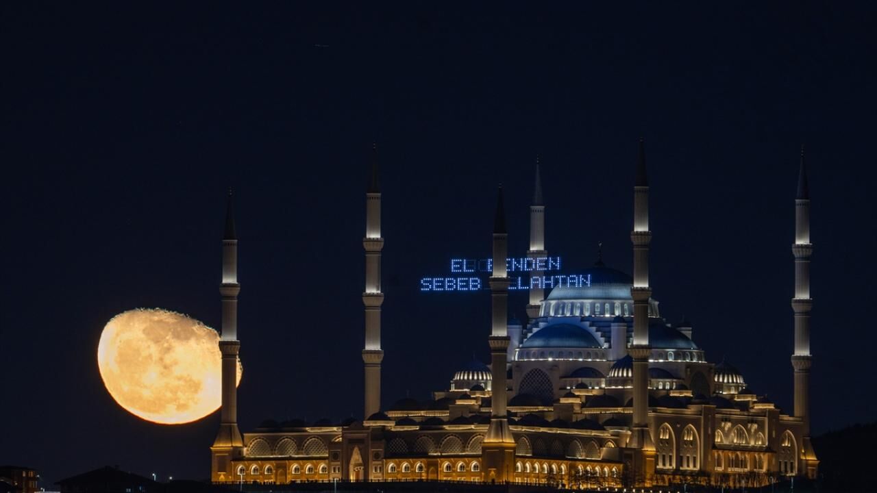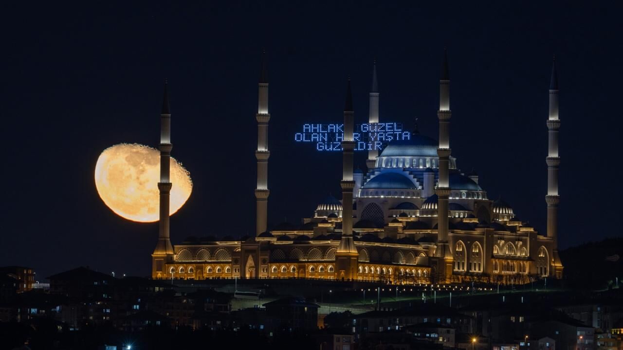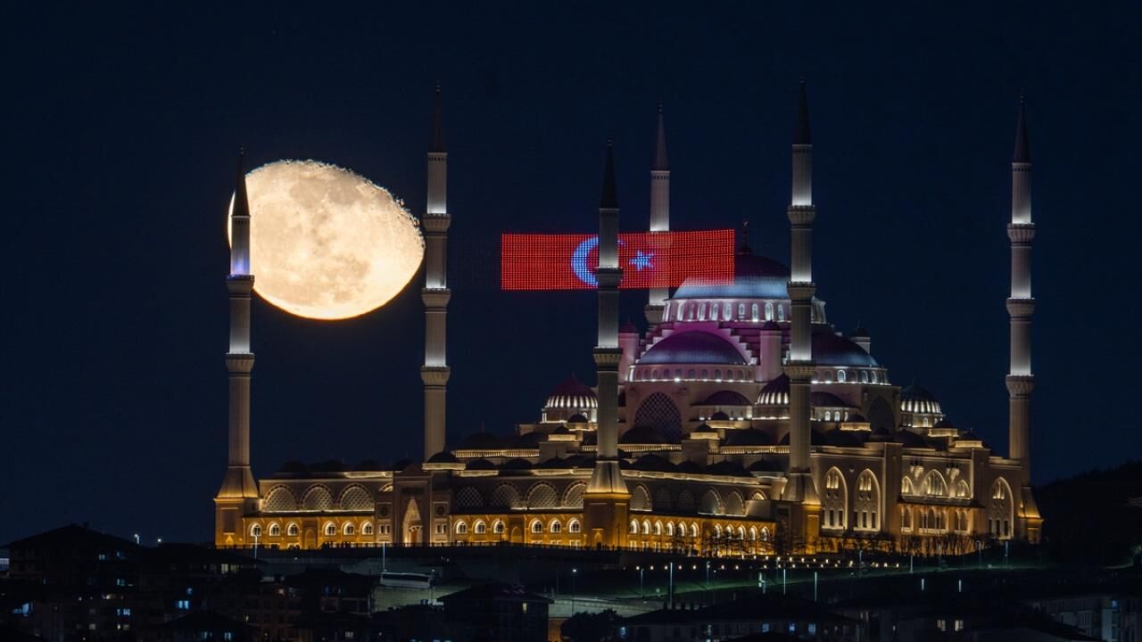 Büyük Çamlıca Camii’nde Ay ve Türk bayrağı görsel şölen oluşturdu