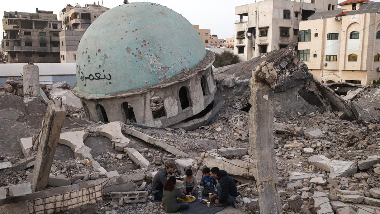 Gazze’nin orta kesimindeki er-Rummal Mahallesi’nde yaşayan Filistinli aile, ramazanın ilk iftarını İsrail’in son saldırılarında yıkılan El Abbas Camisi’nin enkazı üzerinde yaptı.