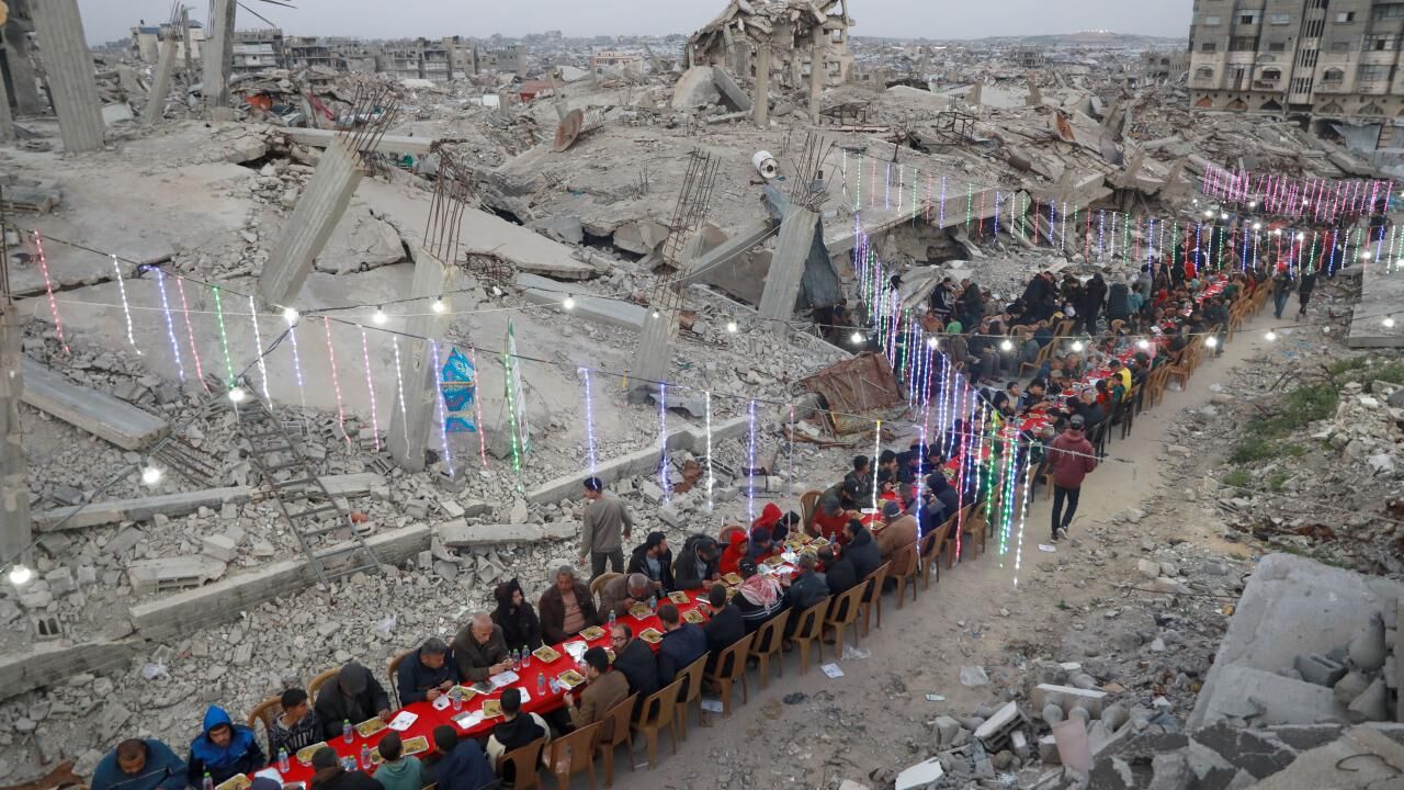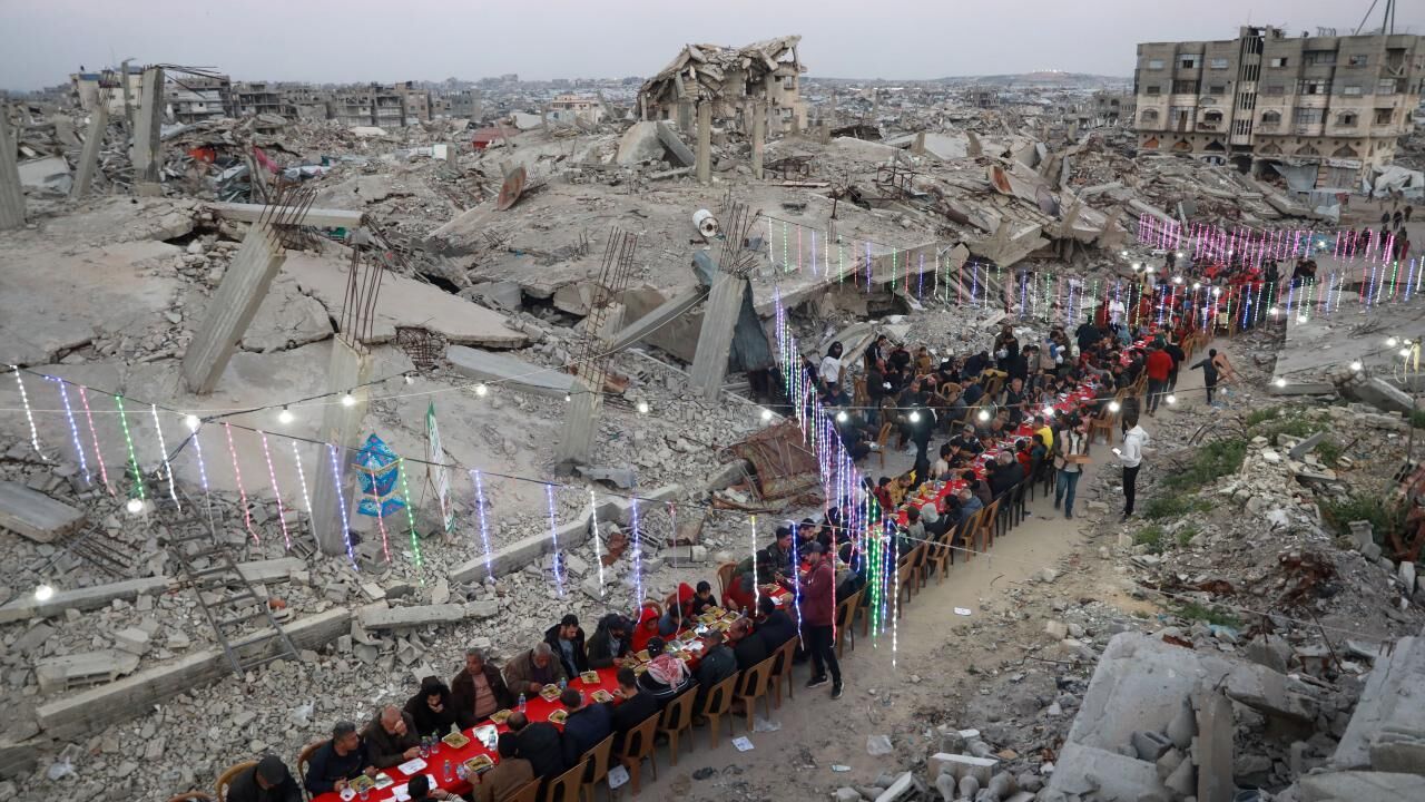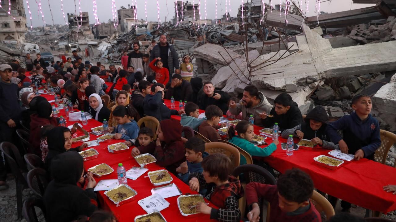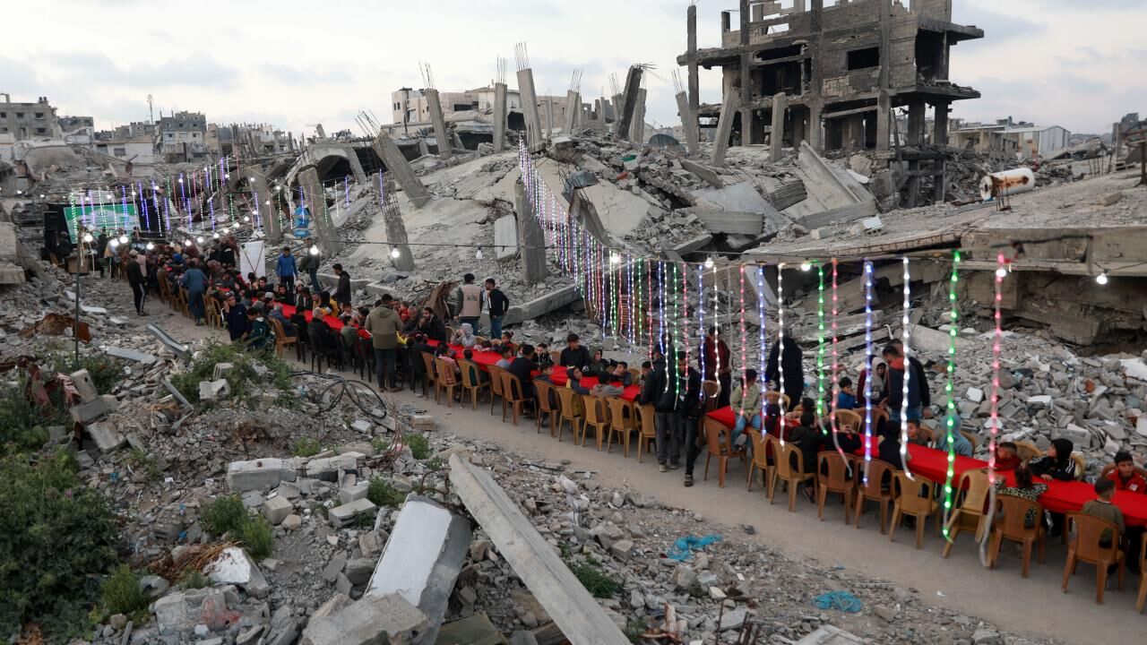 İsrail saldırılarında yıkıma uğrayan Gazze’nin Şeyh Radvan Mahallesi’nde, bir hayır kurumu tarafından toplu iftar programı düzenlendi. Yıkılan binalar arasında bir araya gelen Filistinliler, birlikte oruçlarını açtı.