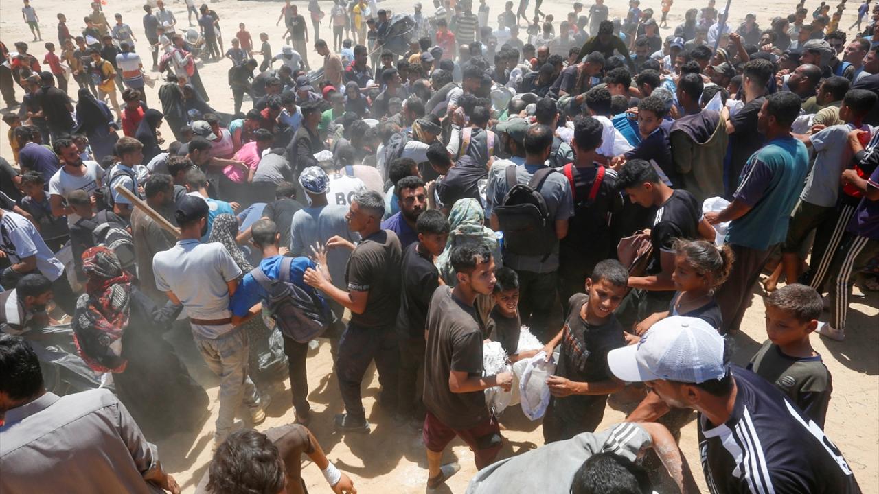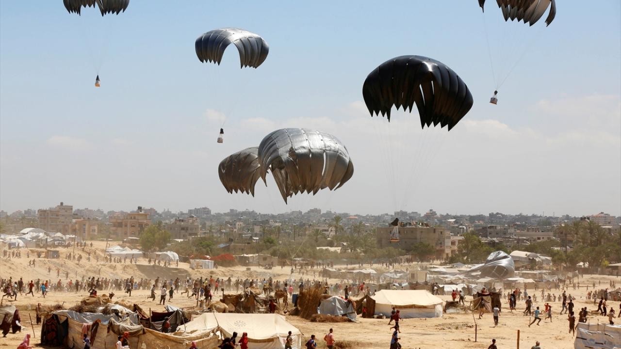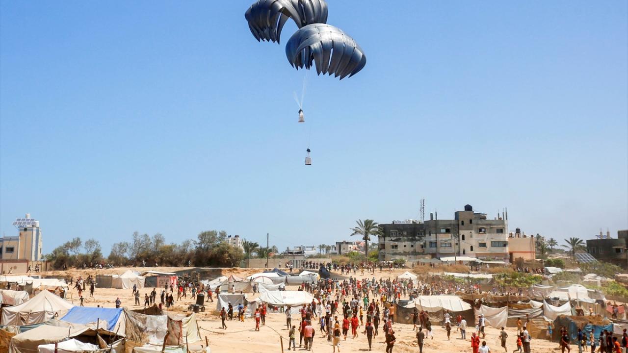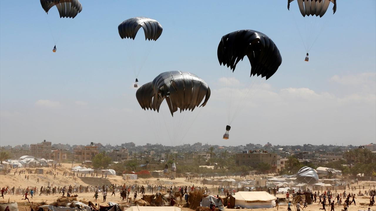 Askeri kargo uçakları tarafından bırakılan yardım malzemelerine ulaşmak isteyen bir grup Filistinli, Gazze'nin orta kesimindeki Zevayide'nin batısında toplandı.