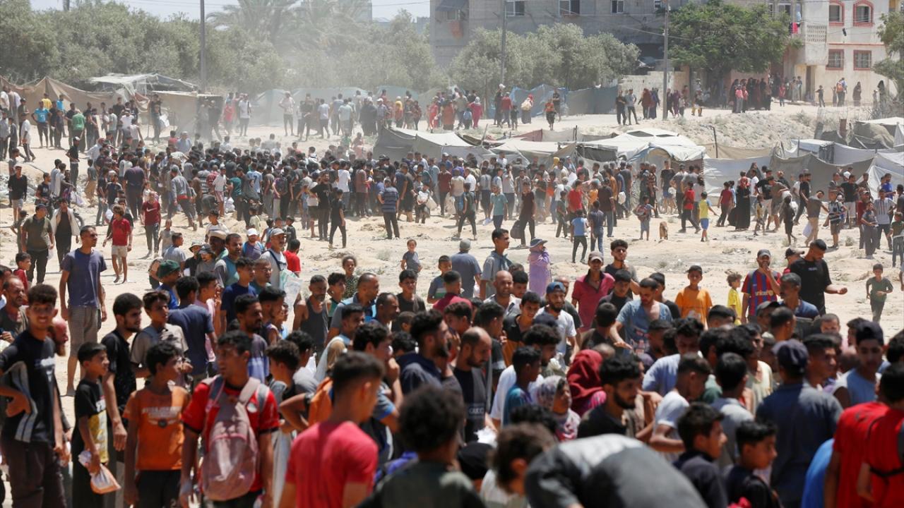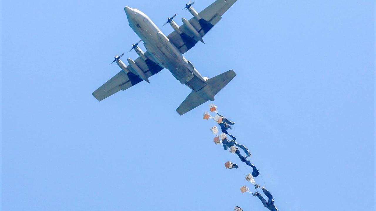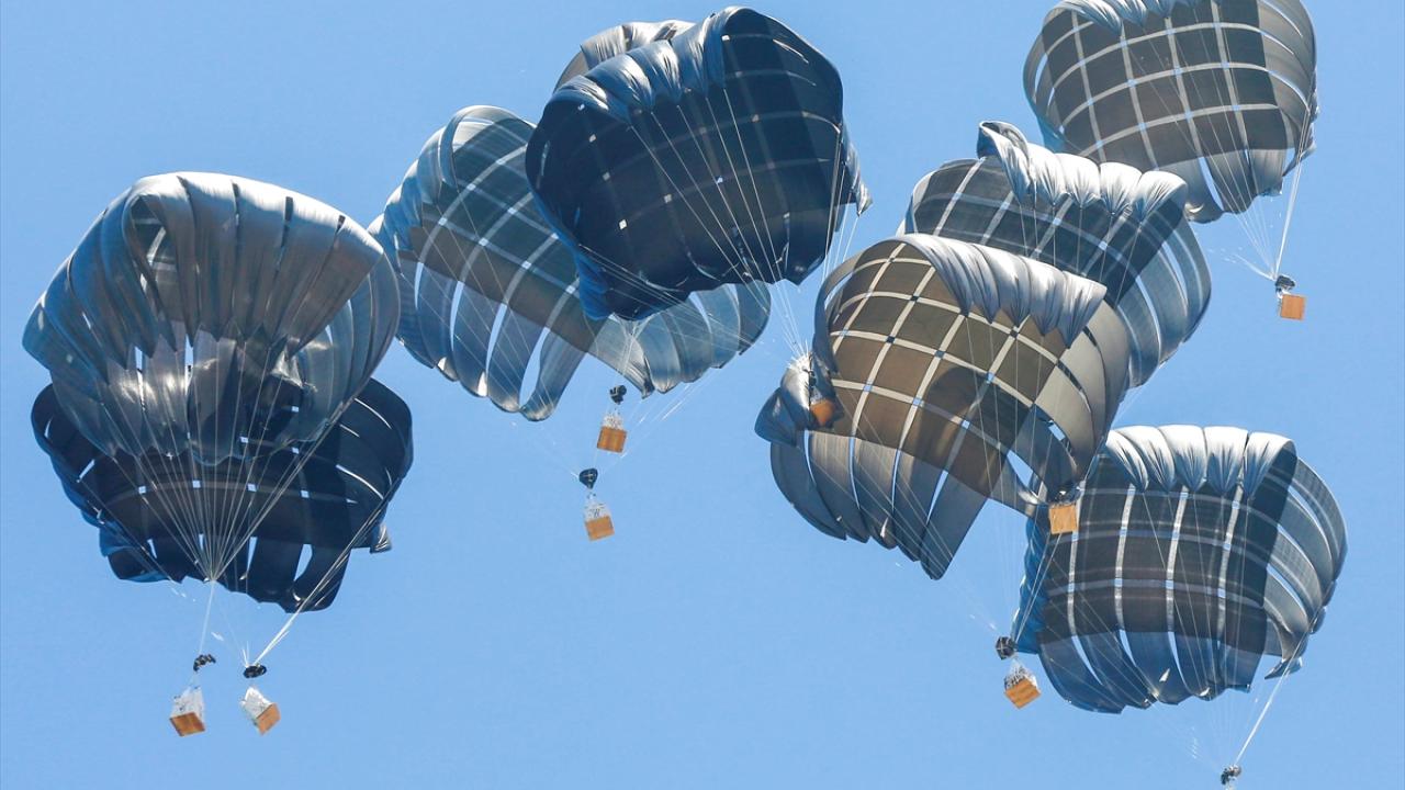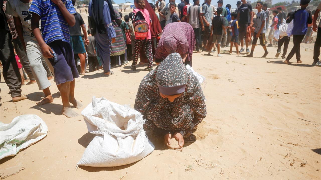Askeri kargo uçakları tarafından bırakılan yardım malzemelerine ulaşmak isteyen bir grup Filistinli, Gazze'nin orta kesimindeki Zevayide'nin batısında toplandı.