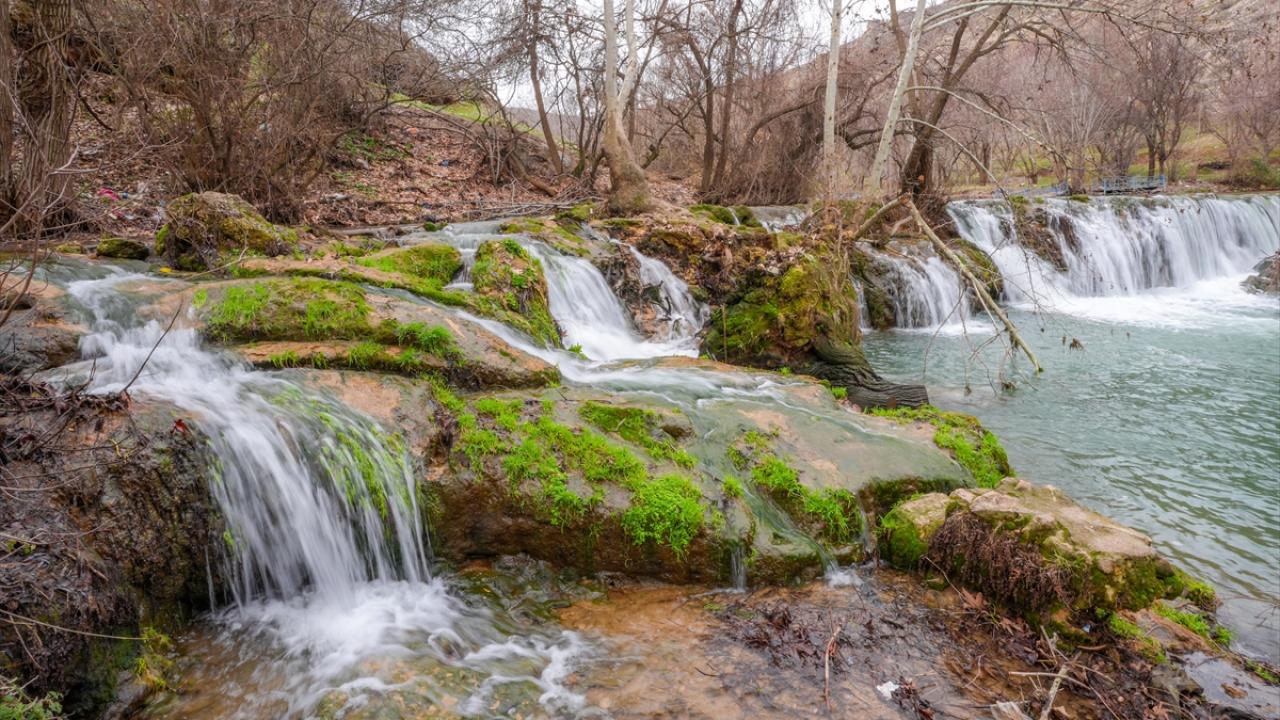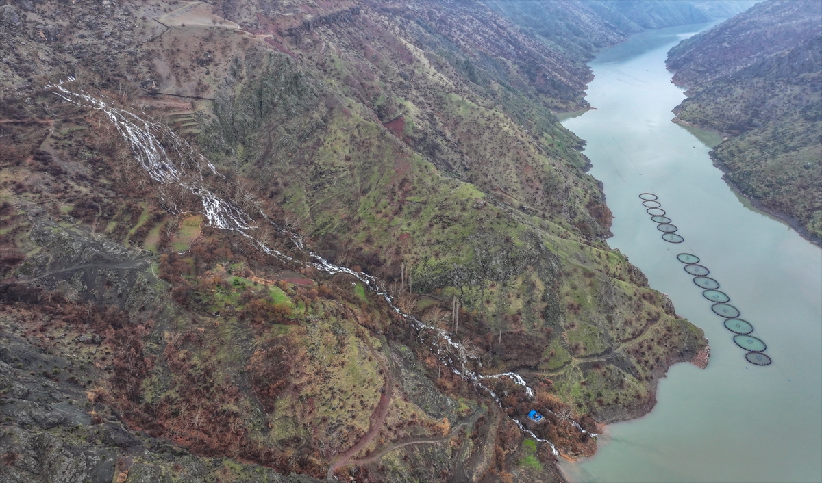 Diyarbakır'ın Çüngüş ilçesinde Maden Dağlarının sarp yamaçlarından çıkan yeni pınarlar şelaleye dönüşerek Atatürk Baraj Gölü'ne dökülüyor.