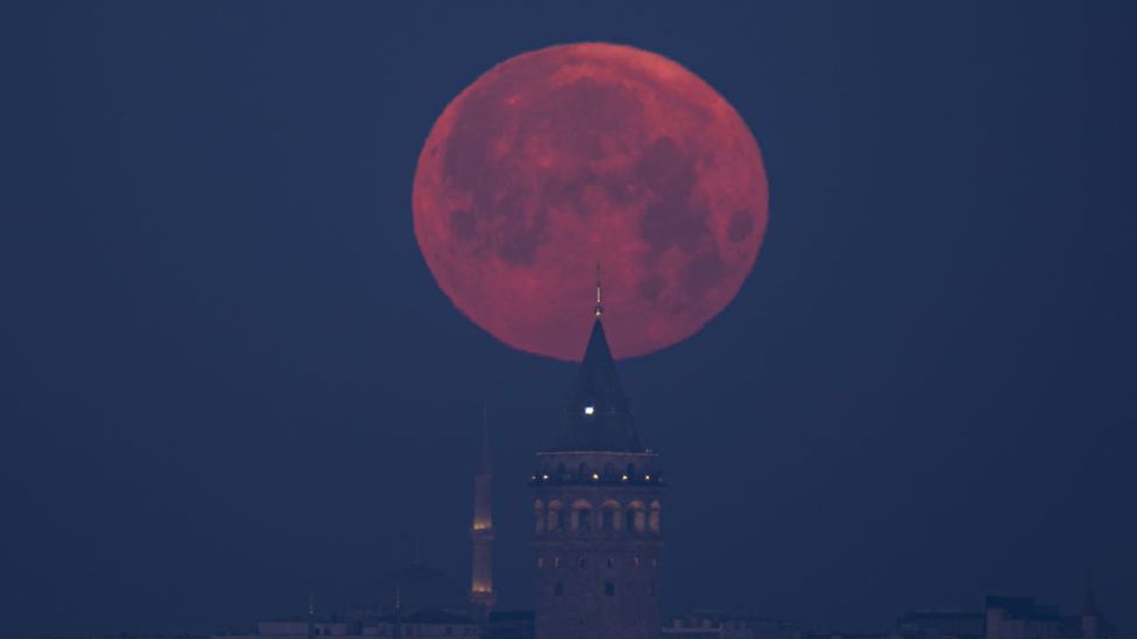 Şehrin simgelerinden biri olan tarihi Galata Kulesi’nin hemen arkasında beliren dolunay, gökyüzünde adeta büyüleyici bir tablo çizdi.