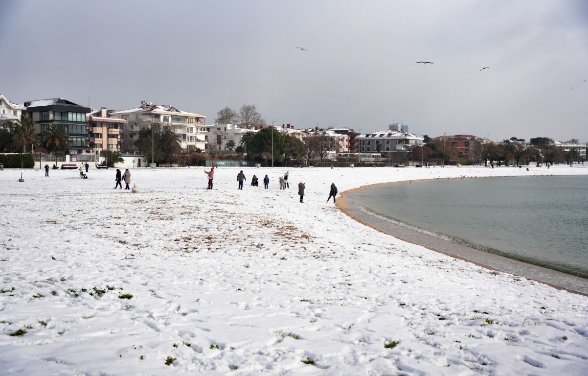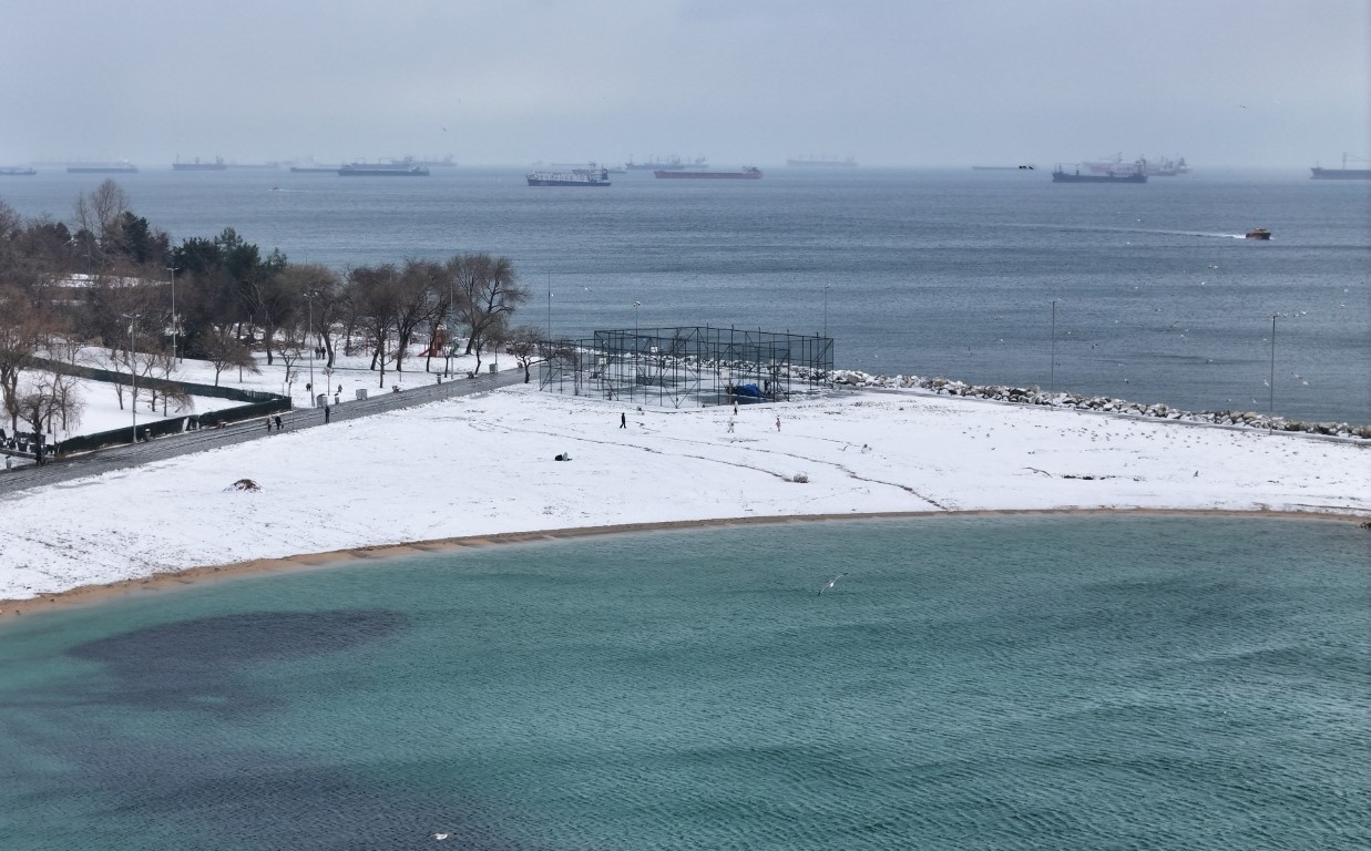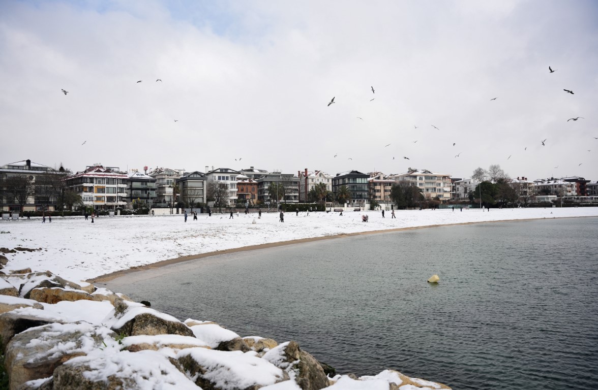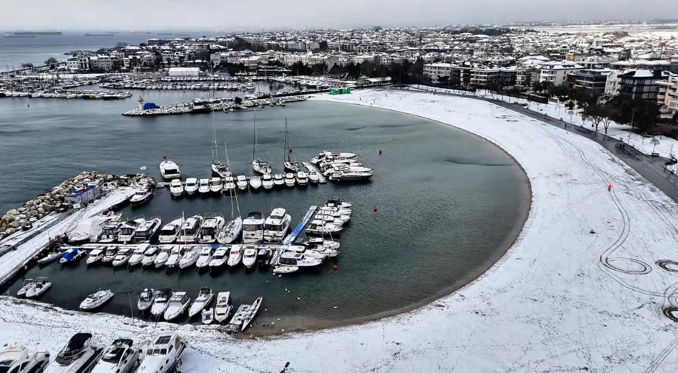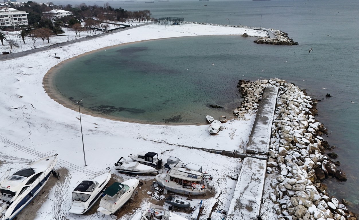 İstanbul'da dün başlayan ve gece saatlerinde etkisini artıran kar yağışı sonrası birçok nokta beyaza bürünürken, Bakırköy'de bulunan Yeşilköy sahili de beyaz örtüyle kaplandı.
