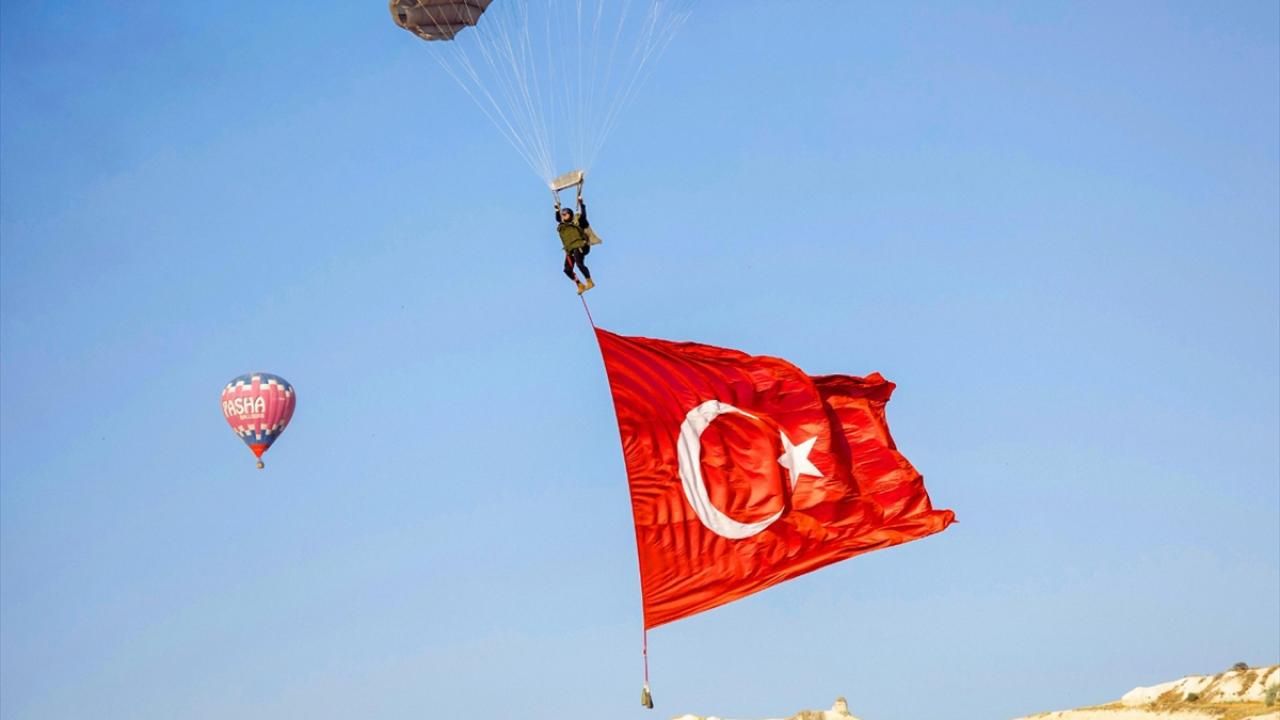 "Jandarma 186 yaşında", "Jandarma bir kanun ordusudur" pankartları, Türk bayrağı ve Gazi Mustafa Kemal Atatürk ile Cumhurbaşkanı Recep Tayyip Erdoğan'ın resimleriyle gökyüzünde süzülen paraşütçüler, Kılıçlar Vadisi yakınlarına indi.