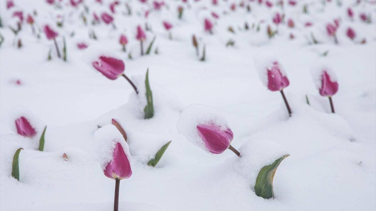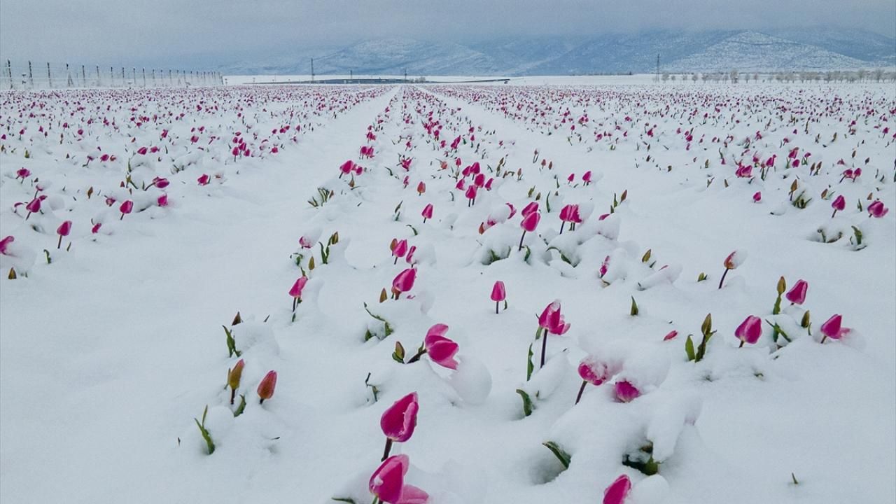 Rengarenk lalelerin yer aldığı tarlada nisan ayında karla kaplanan laleler, görsel şölen sundu.