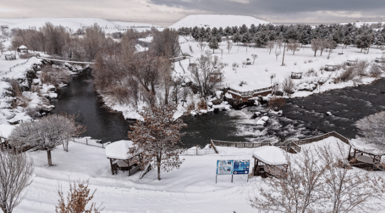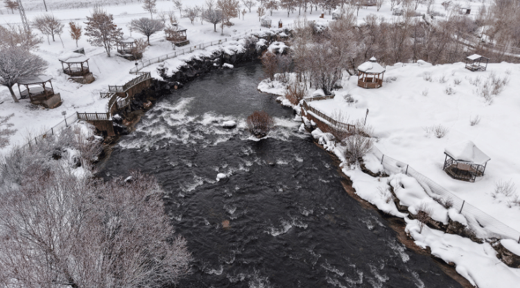 Van'ın Erciş ilçesindeki İnci Kefali Tabiat Parkı, kar yağışının ardından beyaza büründü.