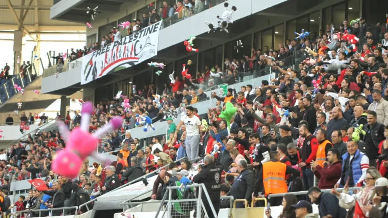 Gençlerbirliği taraftarı, müsabaka öncesi Gazzeli çocuklar için sahaya oyuncak attı.