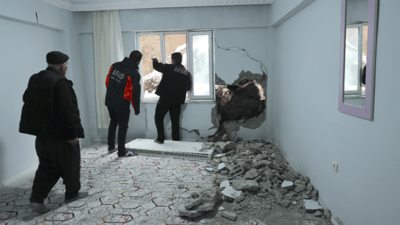 Karşıyaka Mahallesi'nde yamaçtan kopan büyük bir kaya parçası Yusuf Dayan'a ait 4 katlı binanın giriş katında bulunan dairedeki odanın duvarına çarptı.