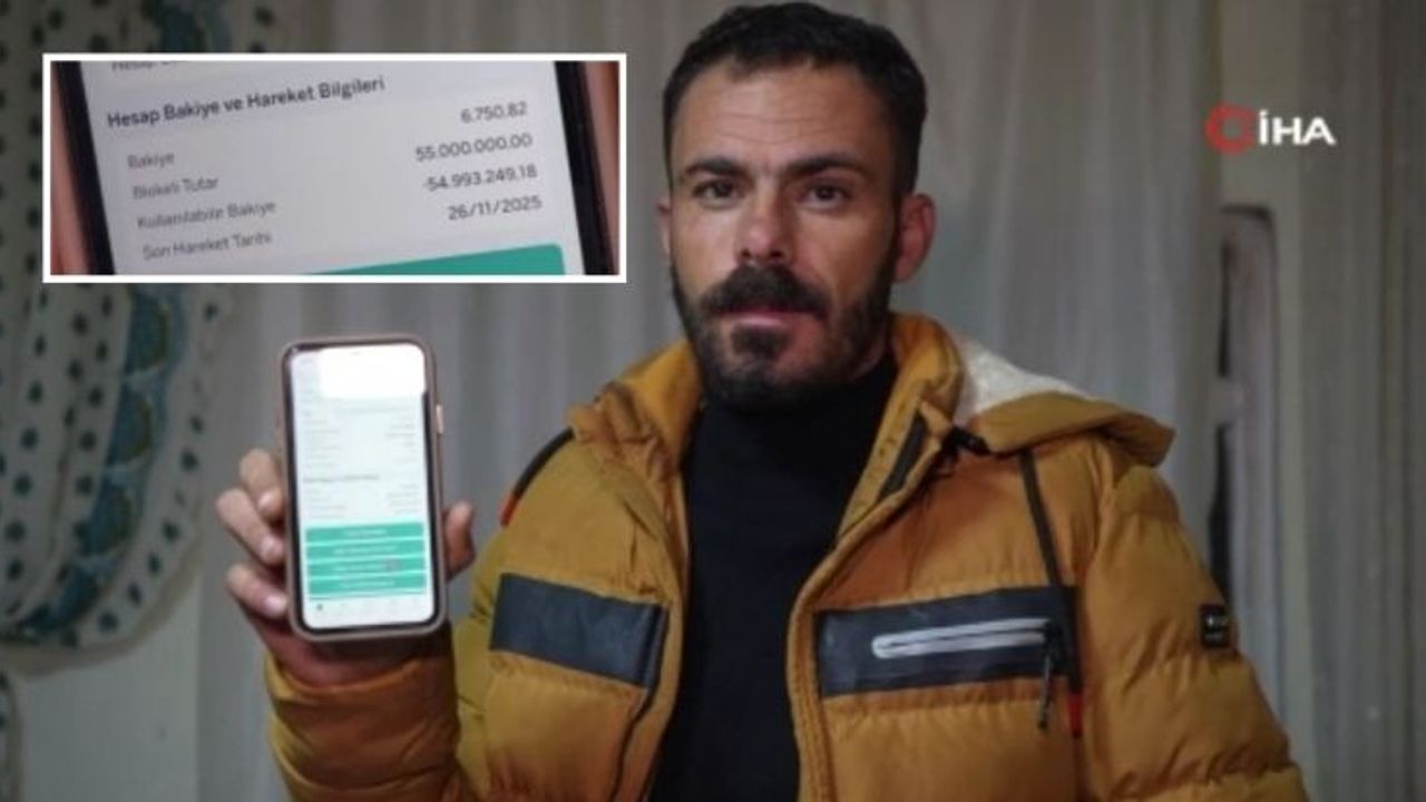 Kırıkkale'nin Keskin ilçesinde yaşayan 34 yaşındaki Adem Gürler, mobil bankacılık uygulamasına girdiğinde bakiyesinde 55 milyon lira olduğunu görünce adeta dili tutuldu. Arkadaşının gönderdiği 6 bin 750 lirayı görmek için hesaba giriş yaptığını belirten Gürler, ekranda milyonlarca lira ile karşılaştığını söyledi. Hesabının bloke edildiğini anlatan Gürler, yetkililerden sürecin açıklığa kavuşturulmasını istedi.