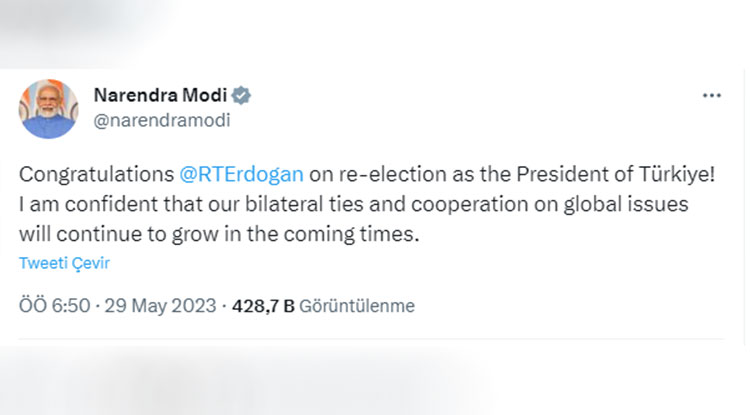 Başbakan Modi, Twitter hesabından yaptığı paylaşımda, "Yeniden Türkiye Cumhurbaşkanı seçilen Erdoğan'a tebrikler." ifadesini kullandı.