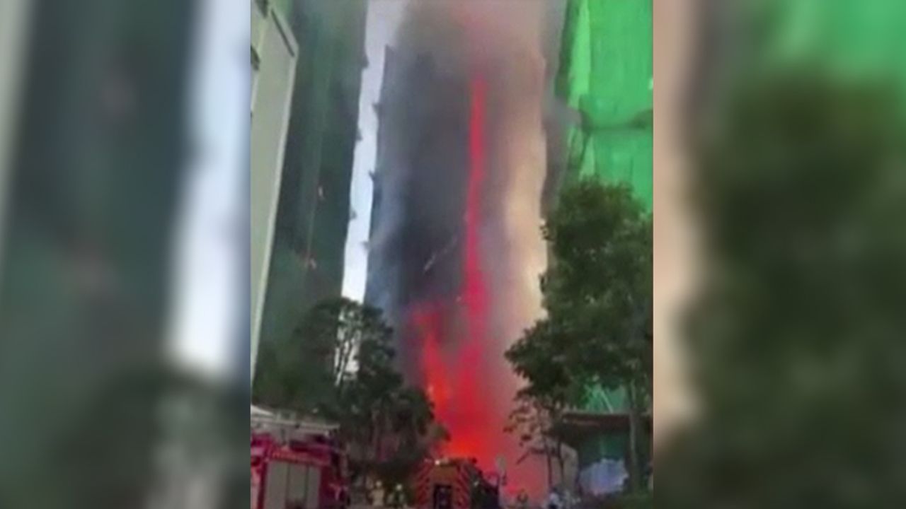 Olay yerinde kaydedilen görüntülerde, itfaiye ekiplerinin, dış cephesi bambu iskelesiyle kaplı olan ve alevler içinde kalan dairelere müdahale ettiği görüldü.