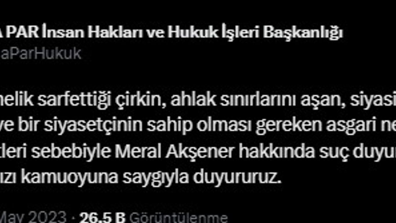 "Partimize yönelik sarfettiği çirkin, ahlak sınırlarını aşan, siyasi olgunluğa yakışmayan ve bir siyasetçinin sahip olması gereken asgari nezaketi ihlal eden hakaretleri sebebiyle Meral Akşener hakkında suç duyurusunda bulunacağımızı kamuoyuna saygıyla duyururuz."