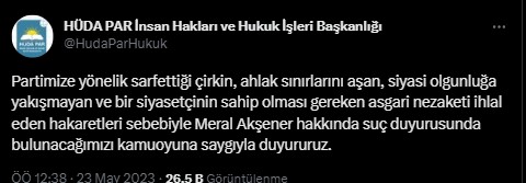 HÜDA-PAR İnsan Hakları ve Hukuk İşleri Başkanlığı’nın Twitter hesabından, Akşener hakkında suç duyurusunda bulunulacağı belirtildi.