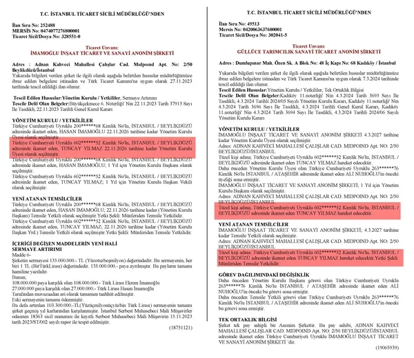 Güllüce Tarımcılık'ta tek yetkili görülen kişi ise kayıt dışı para soruşturmasında İmamoğlu İnşaat yetkilisi olarak ismi geçen Tuncay Yılmaz.