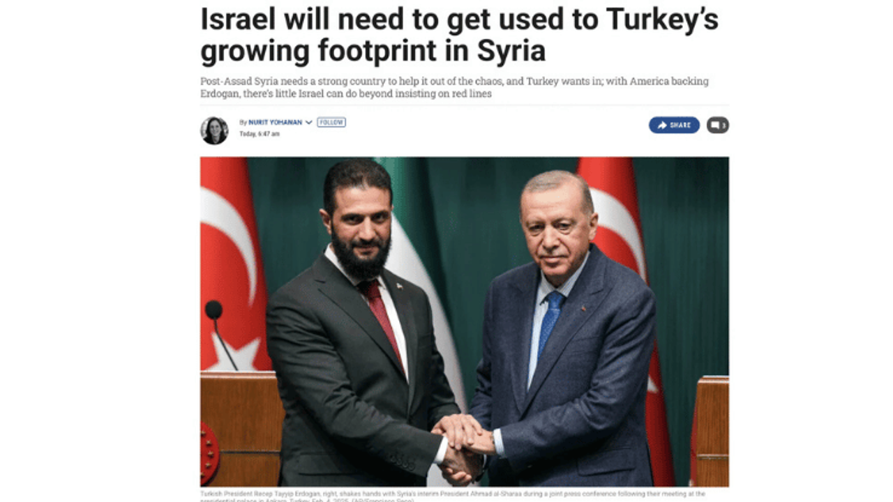 "İsrail'in Türkiye'nin Suriye'deki büyüyen etkisine alışması gerekecek" başlığı ile servis edilen yazıda "Esad sonrası Suriye'nin kaostan kurtulmasına yardımcı olacak güçlü bir ülkeye ihtiyacı var ve Türkiye de buna katılmak istiyor; Amerika'nın Erdoğan'ı desteklemesiyle İsrail'in kırmızı çizgilerde ısrar etmekten başka yapabileceği pek bir şey yok." denildi.
